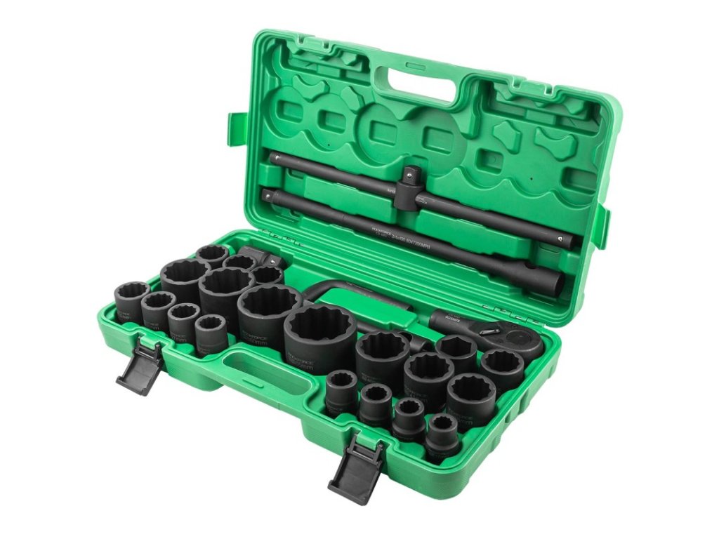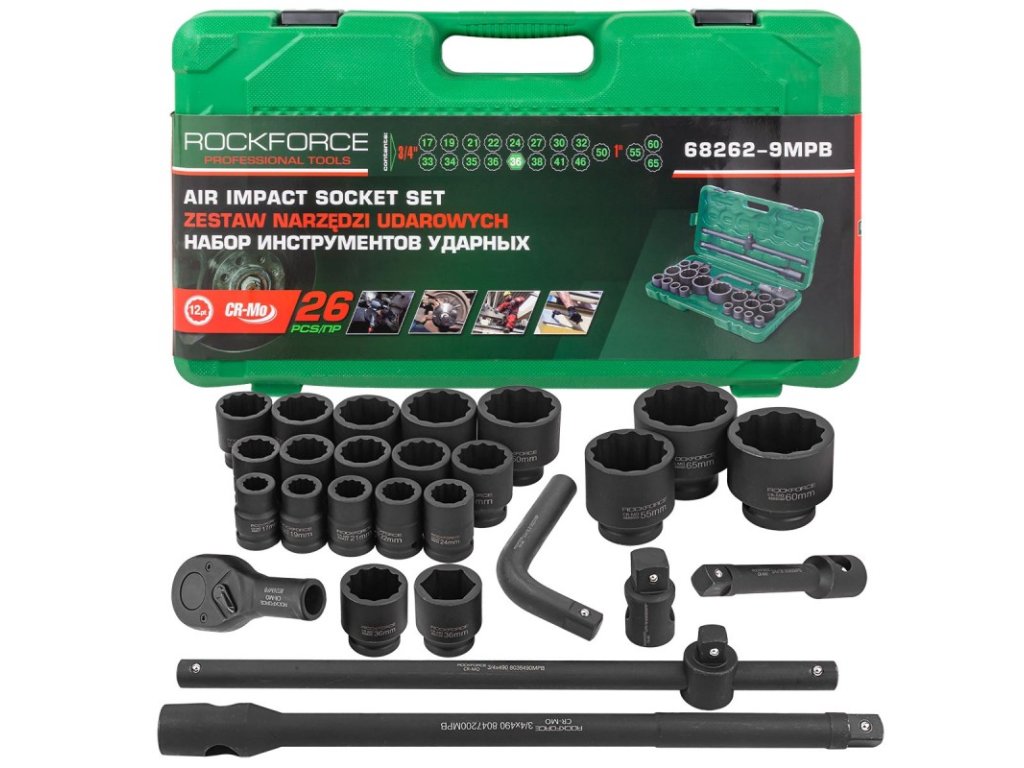 - Dugókulcsok (3/4"): 17, 19, 22, 24, 27, 30, 32, 33, 34, 35, 36, 36 (imbusz), 38, 41, 46, 50