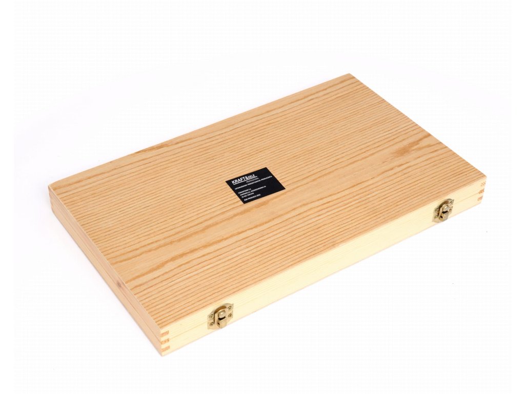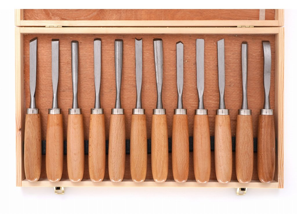 A vésők egy fa kazettában vannak csomagolva.