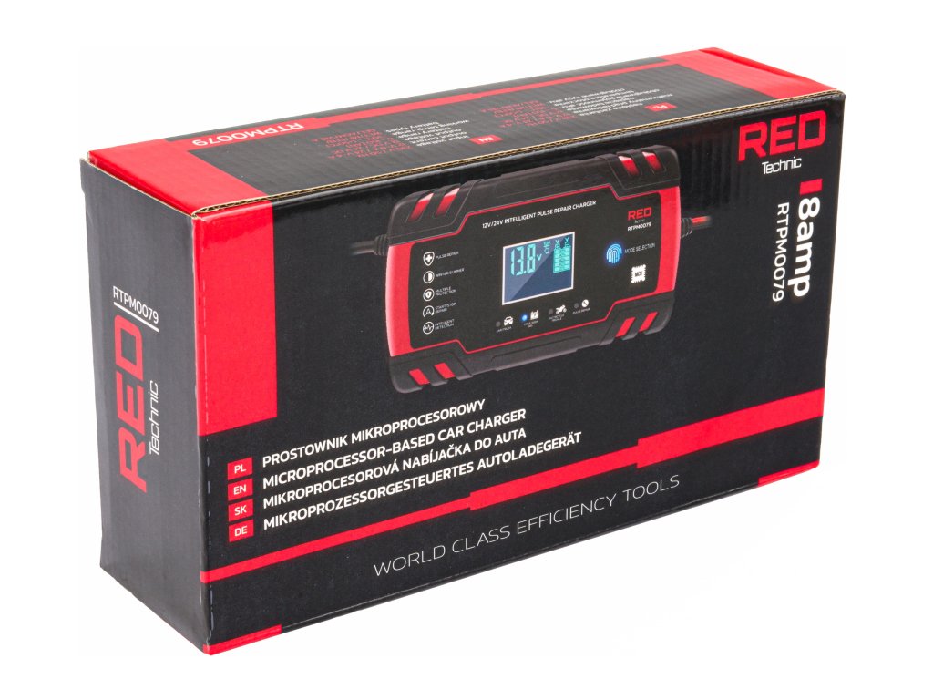 A RTPM0079 kiváló minőségű automata és pontos mikroprocesszoros akkumulátor töltő nagyszerűen alkalmazható professzionális szervizek és autószerelő műhelyek mellett, valamint otthoni garázsokban is. Az eszköz lehetővé teszi a 12V és 24V feszültségű akkumulátorok töltését.