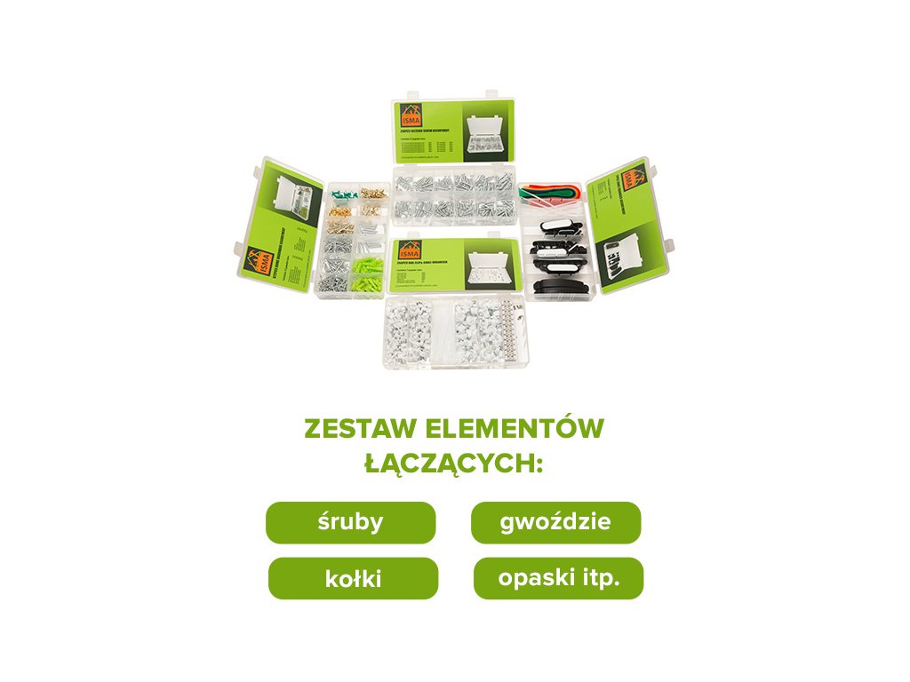 - 1239 darabos rögzítőelem-készlet: csavarok, tiplik, kábelkötegelők stb.