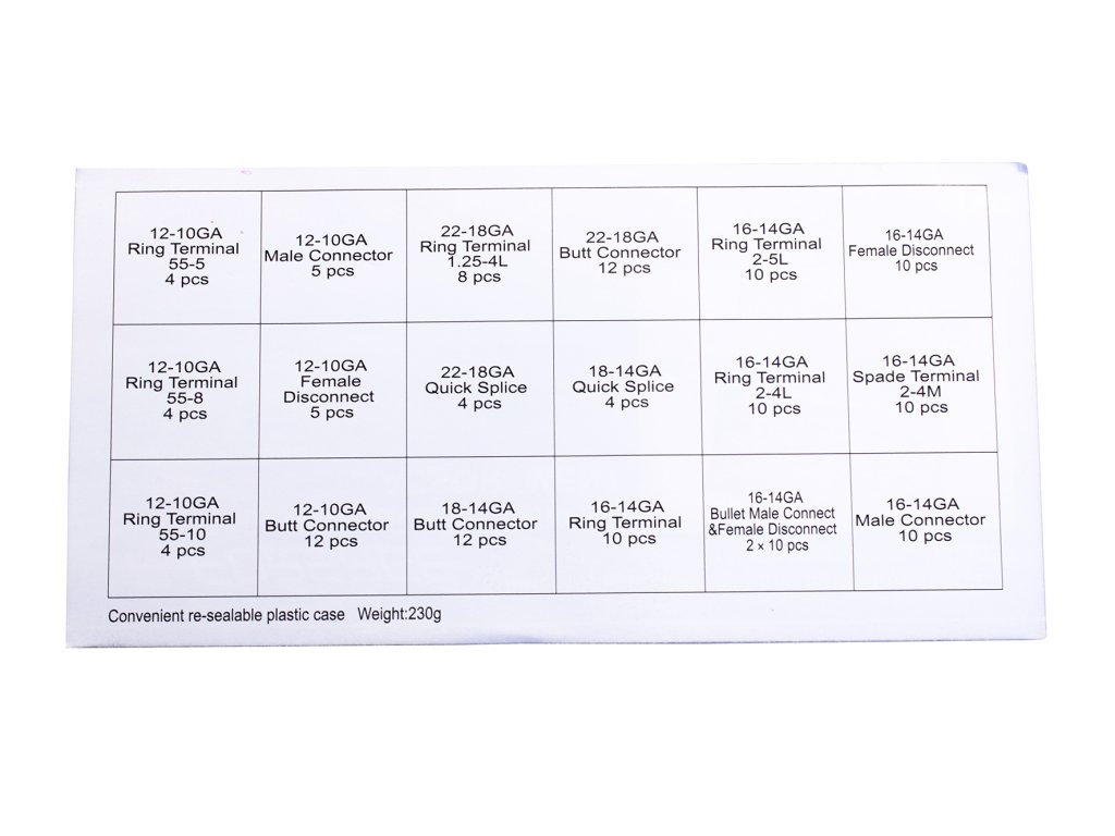 A csatlakozók rendezettek és jelöltek, a készlet több méretet tartalmaz, amelyek különböző alkalmazásokhoz alkalmasak.