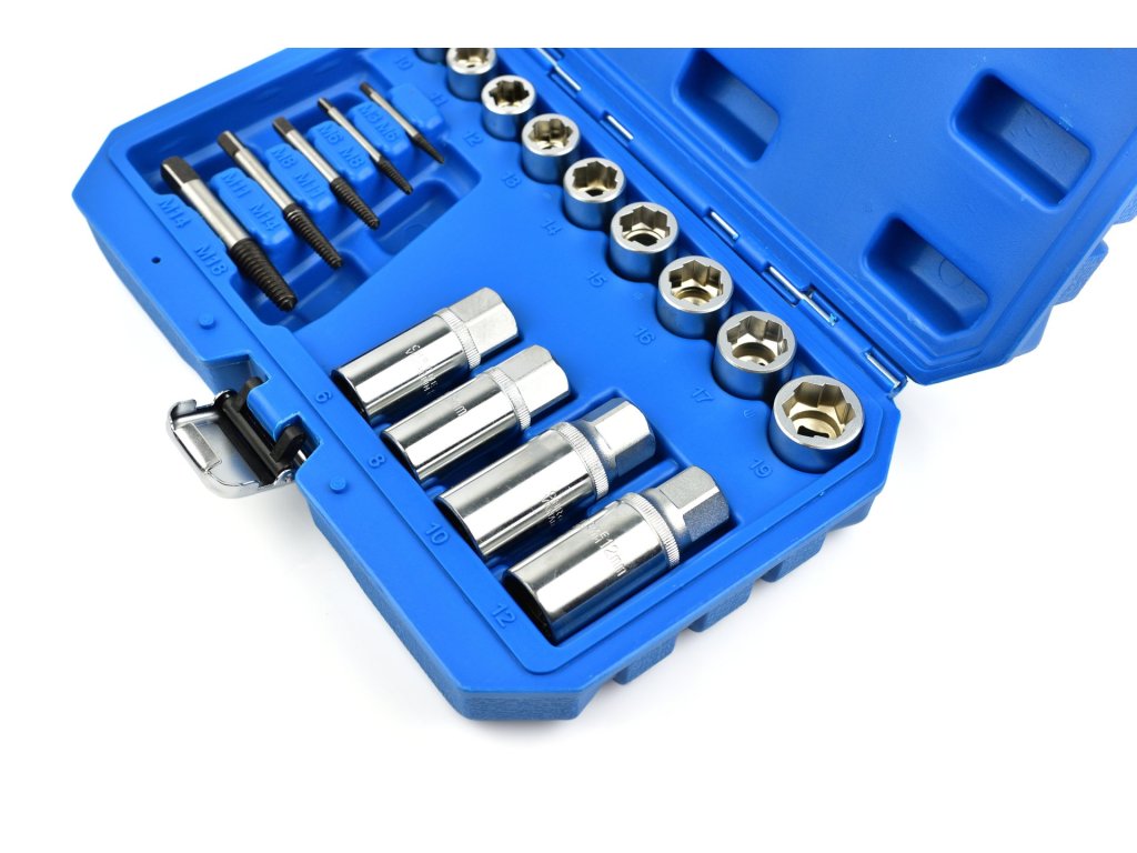 17 db-os csavar- és tűzőkapocs készlet G30035 minden szükséges megoldást kínál a sérült menetek javításához. Ez a komplex szett 18 részt tartalmaz, és három speciális szerszámkészletet foglal magába: 3/8”-os fejeket a sérült vagy lekopott anyák eltávolítására, törött csavarok eltávolítóit, valamint 1/2”-os fejeket a törött tűzőkapcsok kivetéséhez.