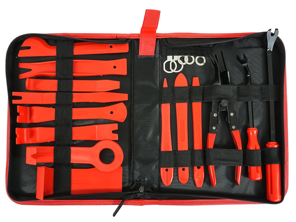 Specializált lehúzók a gépjárművek kárpitjának és díszléceinek eltávolításához. A készlet 19 elemet tartalmaz, amelyek lehetővé teszik a kárpit gyors demontálását bármilyen gépjármű belső teréből. A készlet elemei edzett nylonból készültek. Speciális profilokkal rendelkeznek, amelyek lehetővé teszik a kar segítségével történő kárpit eltávolítást. A készlet nagy előnye, hogy nem karcolja meg a kárpitot vagy a lakkozott elemeket. A készlet használatát ajánljuk autószervizekben, kárpitos, karosszérialakatos és festőműhelyekben.