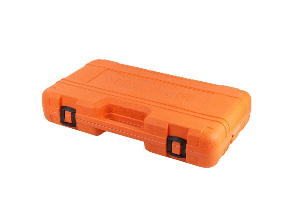 A készlet 26 alkatrészt tartalmaz. Minden fej és adapter egy praktikus műanyag tokban található, amely biztonságos szállítást biztosít a spontán kinyílás veszélye nélkül.