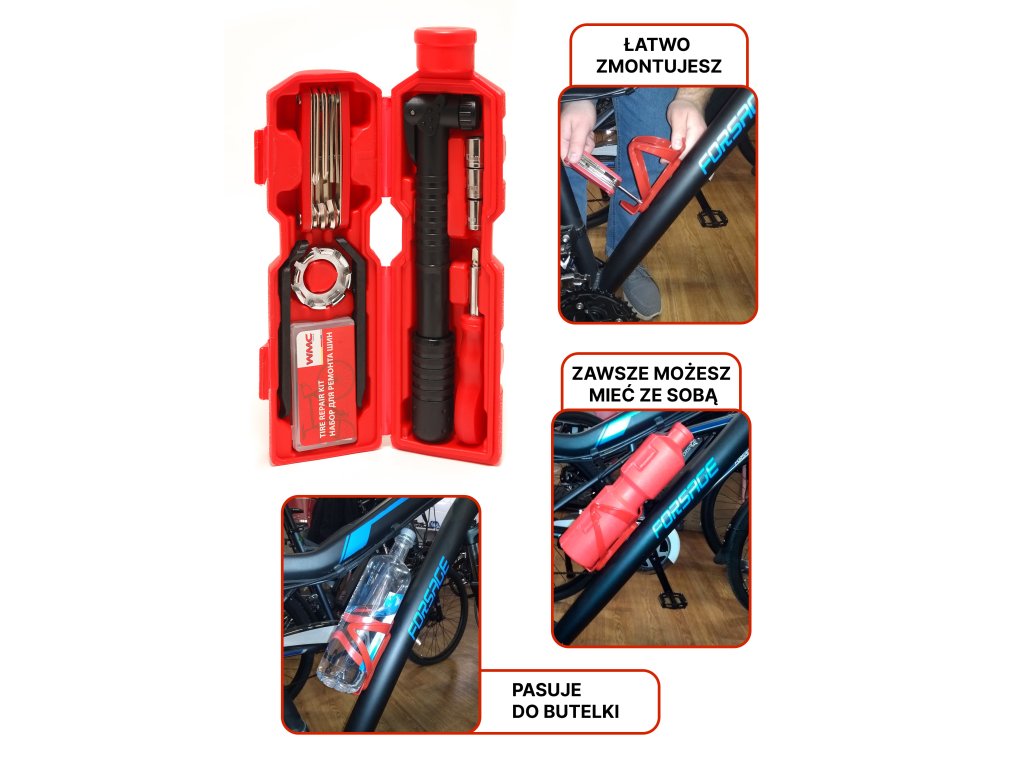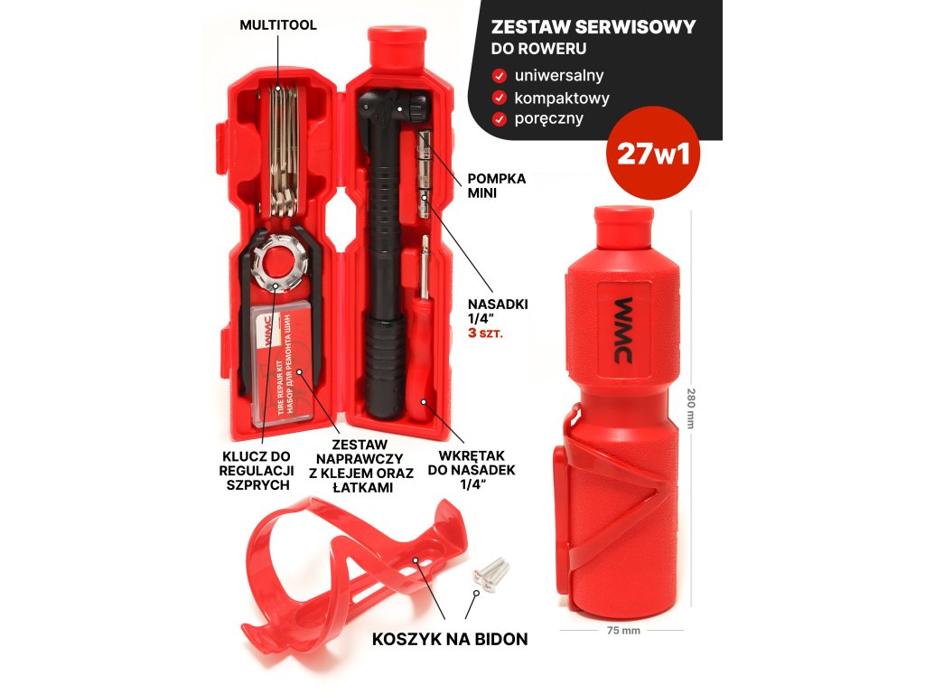 27 darabos kerékpárjavító készlet, palackkal együtt