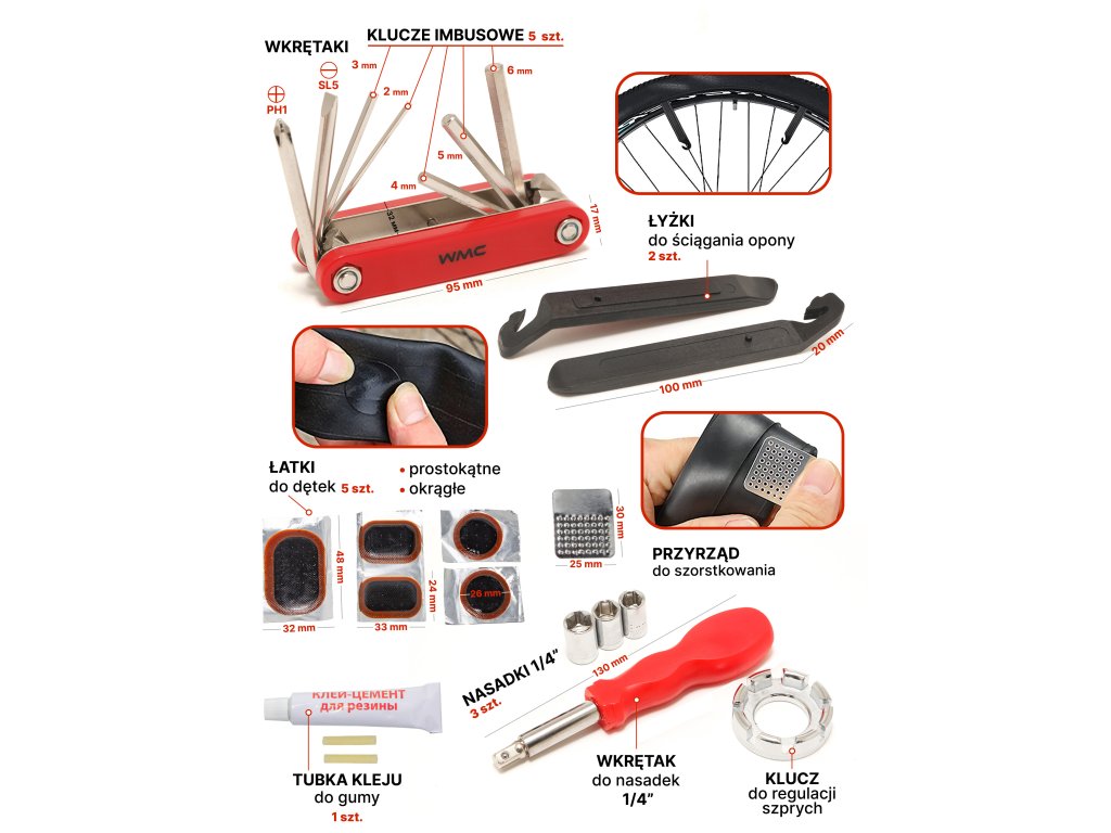 A készletünk összesen 27 alkatrészt tartalmaz, mégis kompakt és tartós. Ezzel a kerékpárjavító készlettel tömíthetsz egy belső tömlőt, cserélhetsz egy kereket, meghúzhatsz egy anyát vagy javíthatsz egy váltót.