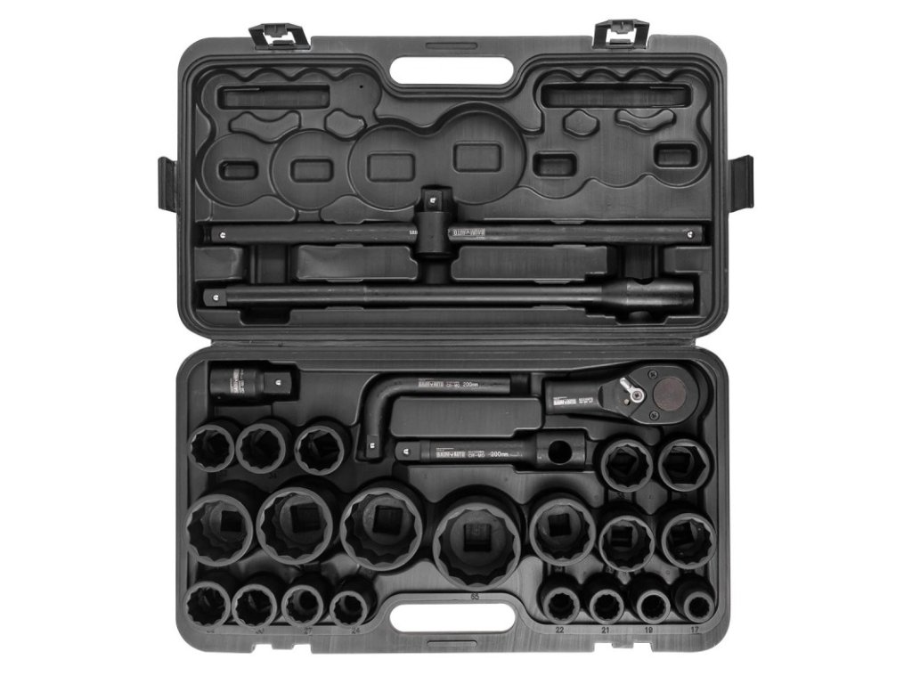 - 12 oldalú 3/4"-os dugókulcsok - 17 db: 17 mm, 19 mm, 21 mm, 22 mm, 24 mm, 27 mm, 30 mm, 32 mm, 33 mm, 34 mm, 35 mm, 36 mm, (36 mm - 6 oldalú), 38 mm, 41 mm, 46 mm, 50 mm