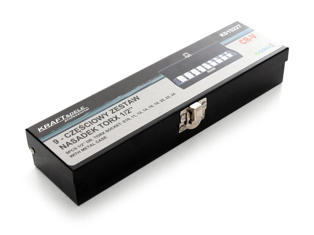 9 részes Torx dugókulcs készlet KD10227 tokban egy 9 részes torx fej készlet 1/2" meghajtáshoz, ideális különböző torx csavarokkal való munkára professzionális és otthoni környezetben. A fejek kiváló minőségű króm-vanádium acélból készülnek, ami garantálja a tartósságot és megbízhatóságot minden munkakörülmény között.