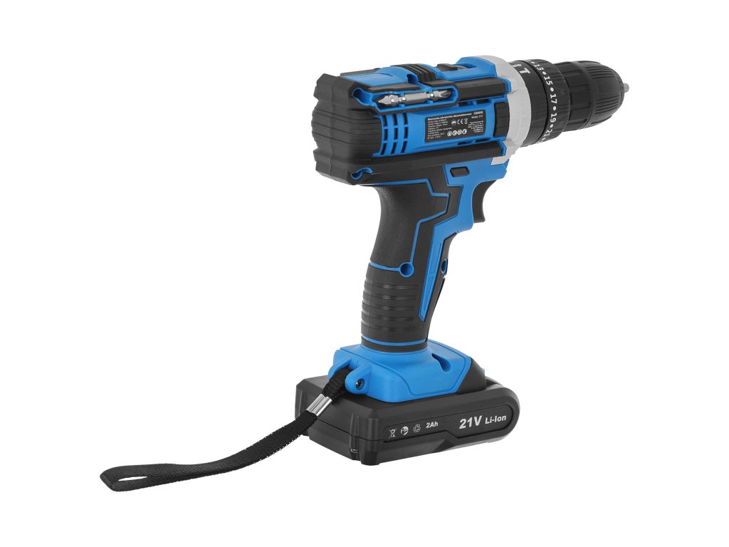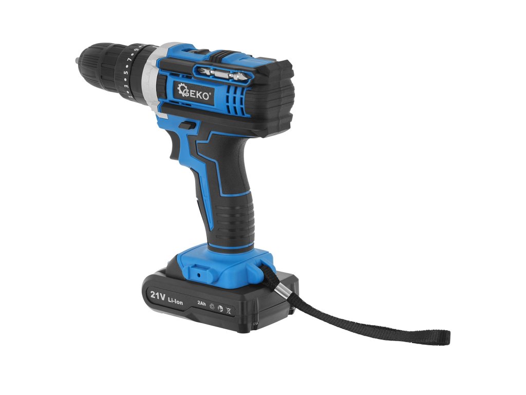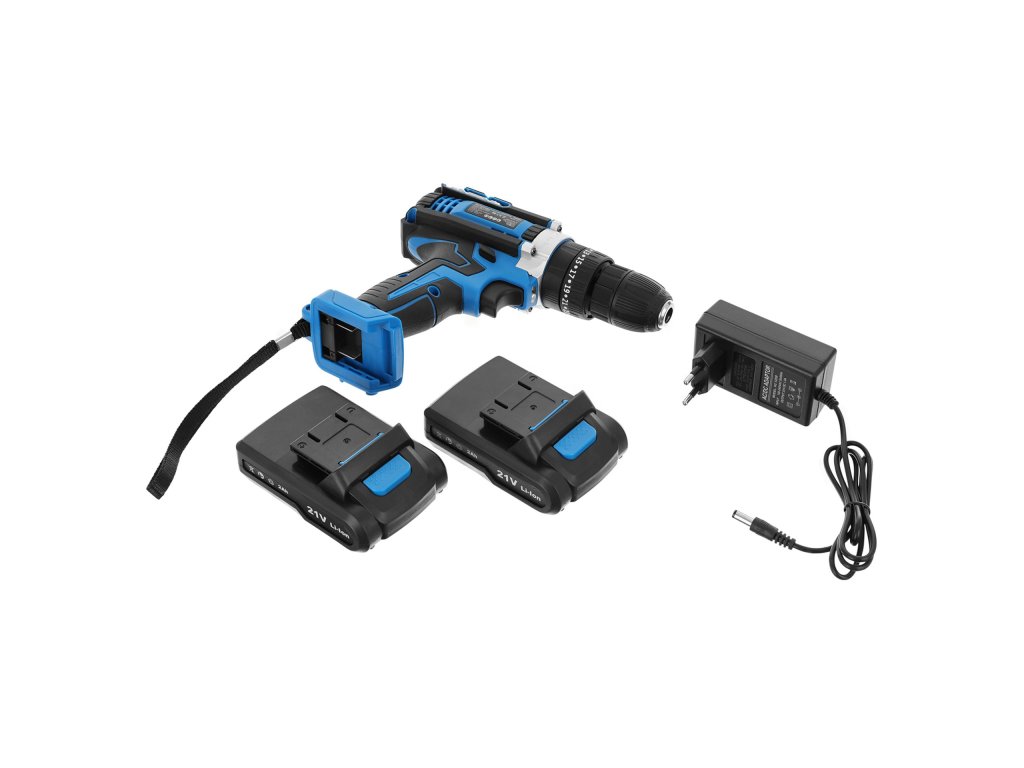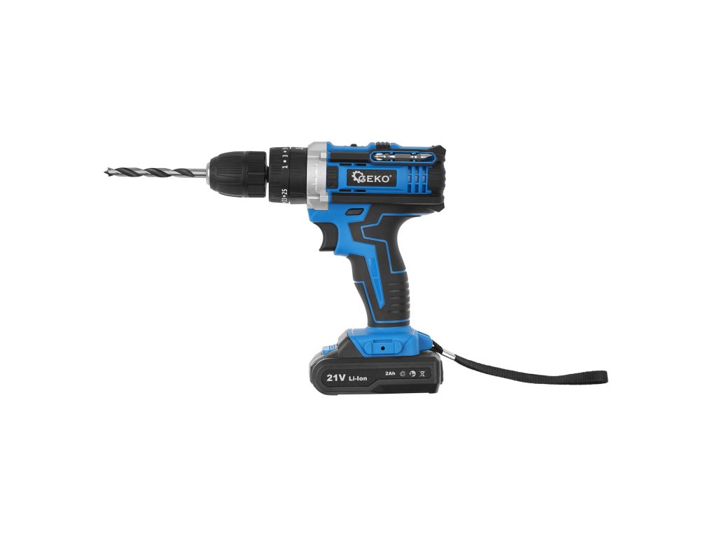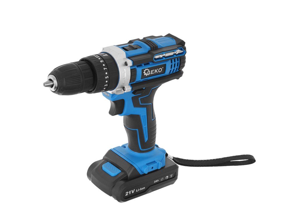 Akkus ütvefúrógép 21V 2x akkumulátor 2Ah G80656 ideális különböző anyagok fúrásához, valamint csavarok, csavarozók és önfúró csavarok behajtásához és kihajtásához. A készlet két darab 2Ah kapacitású akkumulátort, töltőt és egy praktikus műanyag tárolótojákat tartalmaz.