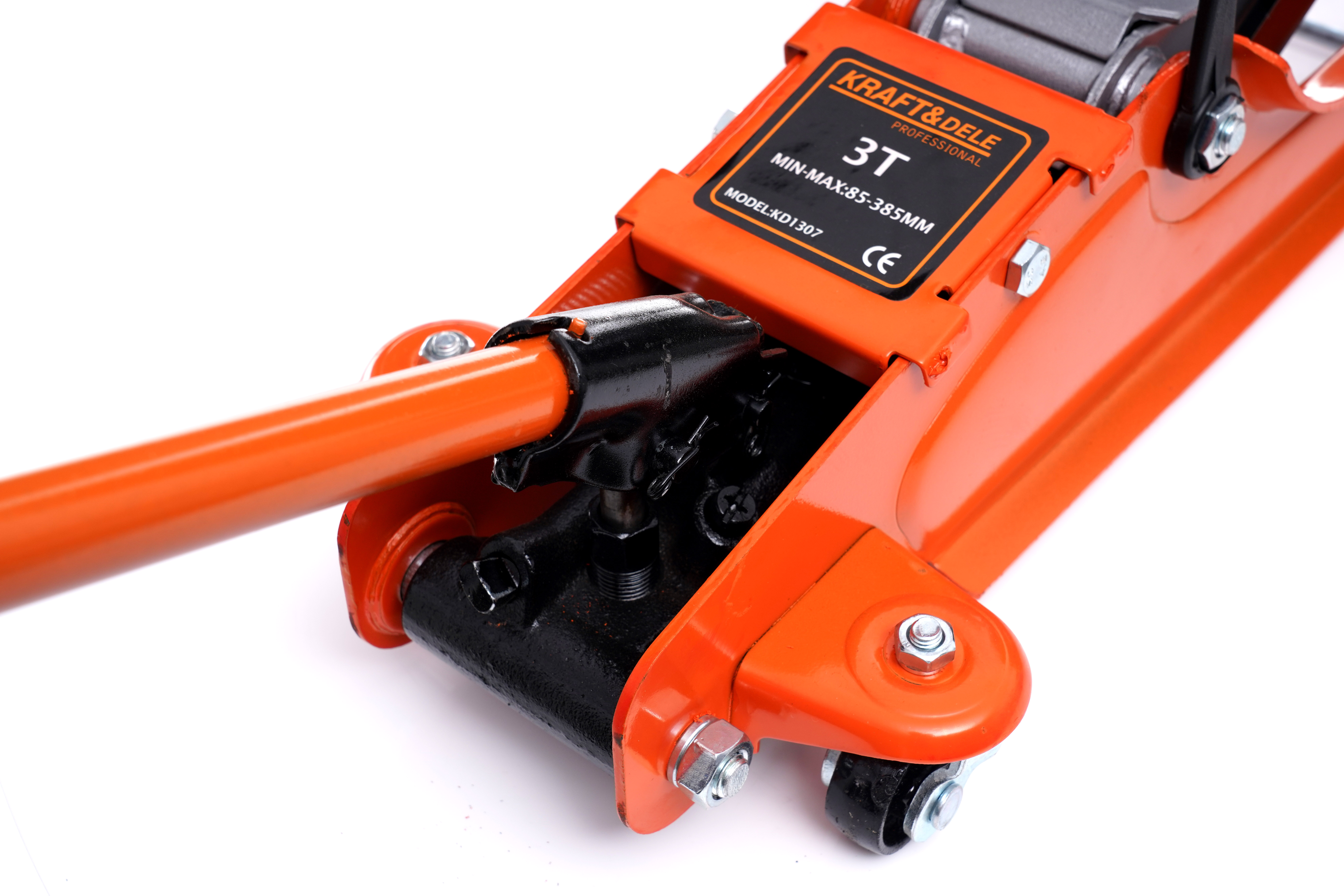 A Kraft&Dele márkájú KD1307 alacsony profilú hidraulikus emelő autók emelésére szolgál 85 mm-től 385 mm-ig terjedő magasságig, szilárd anyagokból készült, hosszú élettartamot és ellenállást biztosítva. A lemez speciális profilokba préselve készül, amelyek növelik a szerkezet merevségét. A görgők lehetővé teszik a könnyű kezelést az autó alatt. Szilárd felépítés.