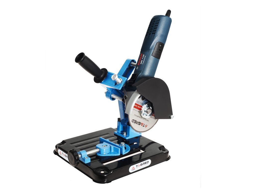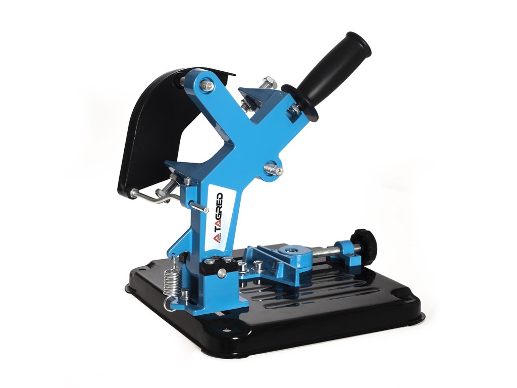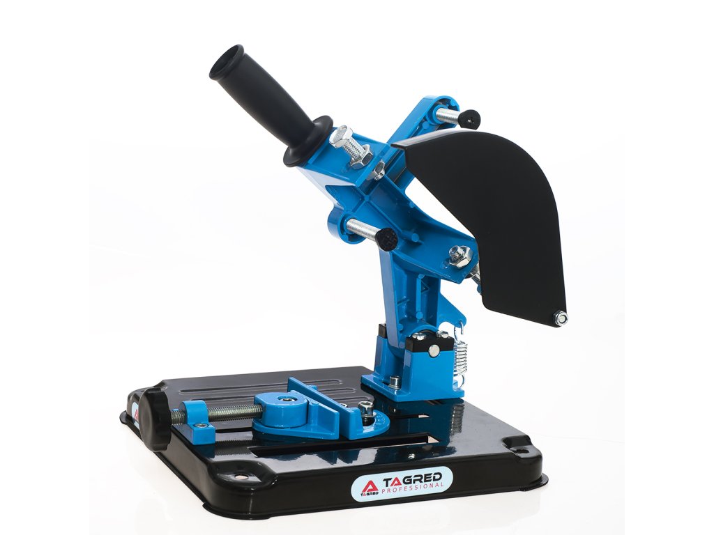 Professzionális állvány sarokcsiszolókhoz 115 és 125 mm átmérőjű vágókorongokkal, ideális eszköz fém elemek precíz vágásához. Ez a robusztus készülék masszív szerkezettel rendelkezik, nyomásalumínium alaplappal, amely könnyen rögzíthető a munkapulthoz. Az állvány teste kiváló minőségű alumíniumból és műanyaglemezből készült, míg az ergonomikus markolat gumiból készült, megkönnyítve a pontos és kényelmes vágást.