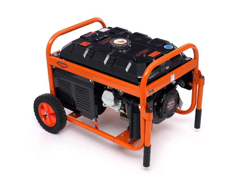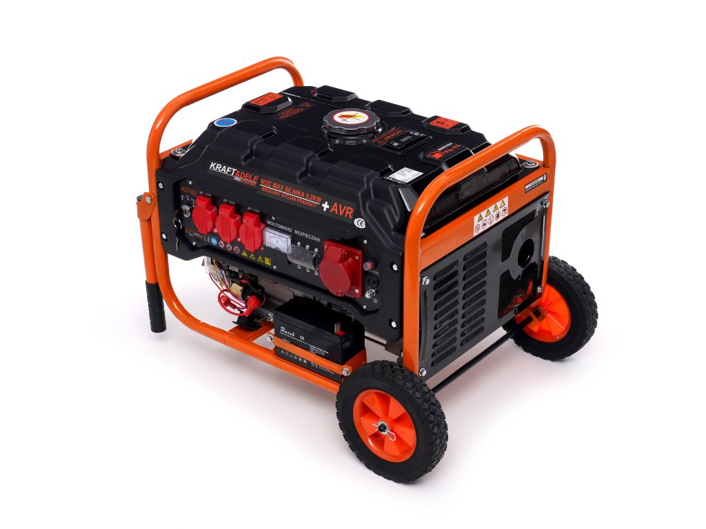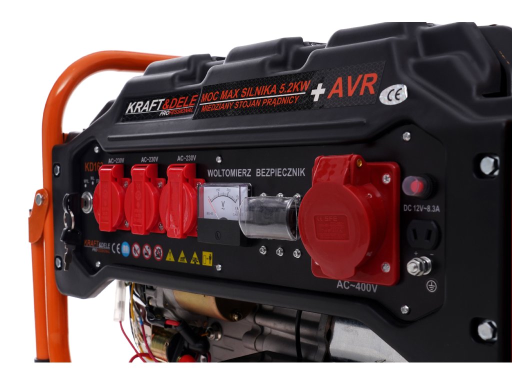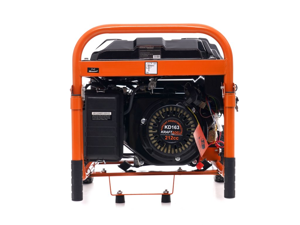 Áramfejlesztő 3500 W 12/230/380 V KD163 – Kraft&Dele márkájú hordozható háromfázisú generátor, amely 220V-400V közötti áram előállítására szolgál OHV-kialakítású, 4 ütemű japán belső égésű motorral, teljesítménye 7 HP/5,2 kW, és a névleges teljesítmény 2800 W.