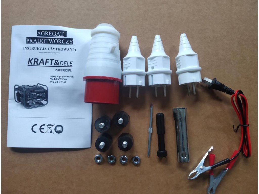 A csomag tartalma • Kraft&Dele KD163 elektromos áramfejlesztő • Akkumulátor töltésére szolgáló kábelek • Szállító kerekek • 230V csatlakozó x3 • 380V csatlakozó x1 • Gyújtógyertya kulcs • Csavarhúzó • Lengyel nyelvű használati útmutató • Eredeti csomagolás |