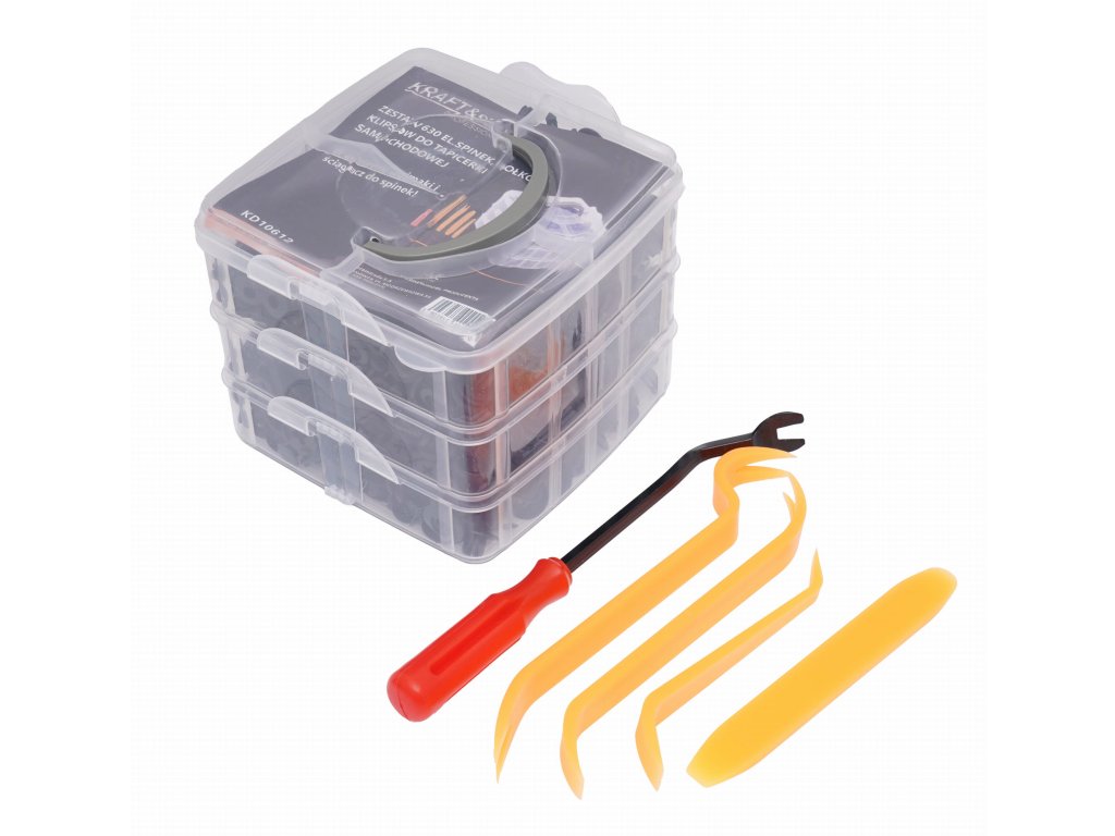 630 darab autókárpitozáshoz használható kapcsok, tüskék és klipszek aKraf&Dele márkájú KD10612 modellhez, a 16 leggyakrabban használt méretet tartalmazza, amelyeket a piacon elérhető legtöbb járműben használnak.