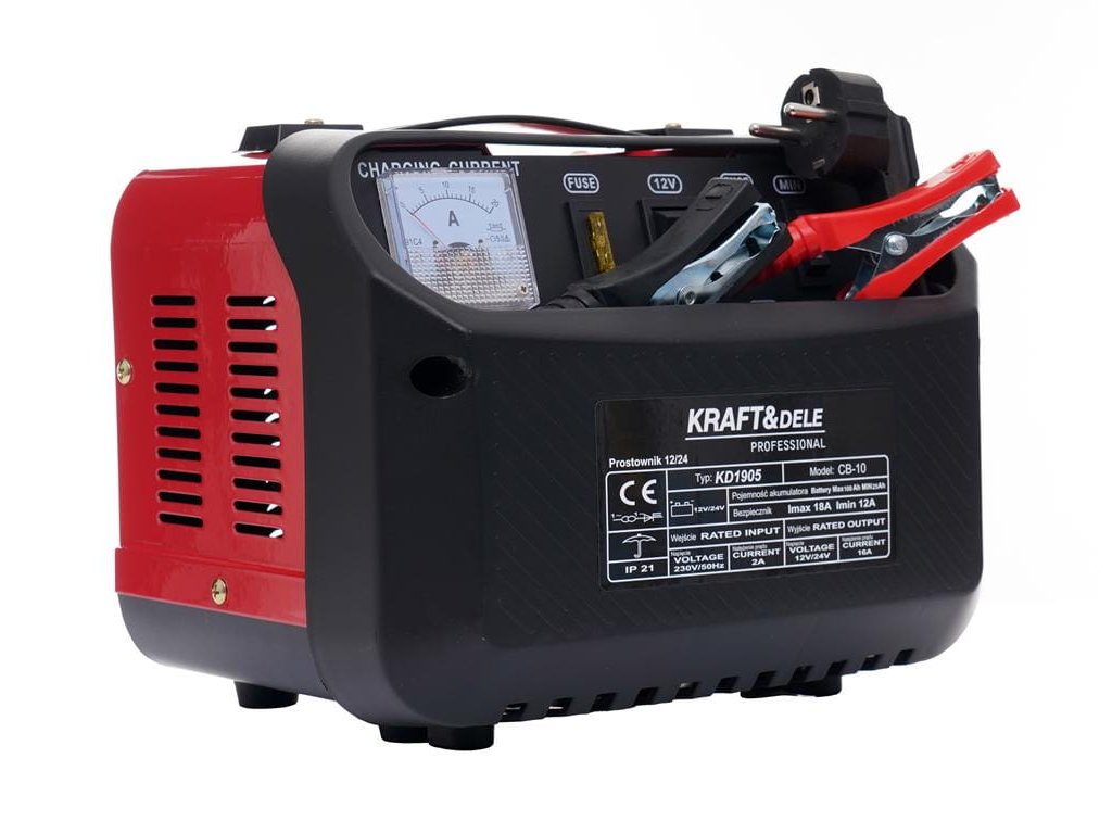 Autós akkumulátortöltő KD1905 12V/24V, 10A, 60Ah a Kraft&Dele cseh vállalat megbízható eszköze, amely 12V/24V-os akkumulátorok töltésére szolgál gyorstöltési funkcióval. Az egyenirányító ampermérővel és biztosítékokkal van ellátva, amelyek megvédik a készüléket a sérülésektől. Lehetővé teszi a 20Ah–60Ah kapacitású akkumulátorok töltését. Az egyenirányító magas minőségű anyagokból készült. A kiemelt biztonság érdekében lemez- és olvadó biztosítékok gondoskodnak. Van rá fogantyú, így könnyen hordozható. Egyszerű és masszív kivitel garantálja a megbízhatóságot és hosszú élettartamot.