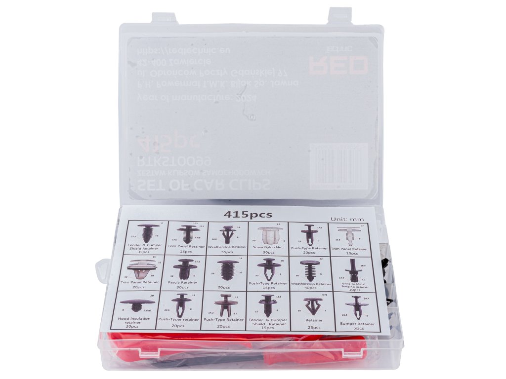 - Tartalmaz 415 darabot különböző méretekben és formákban, amelyek a legtöbb autótípushoz illeszkednek.