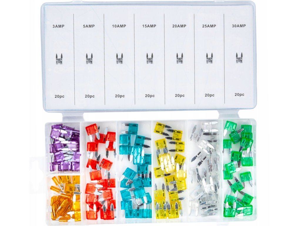 A készlet praktikus és kényelmes tároló dobozban van elhelyezve, amely lehetővé teszi a biztosítékok áramérték szerinti rendezését.