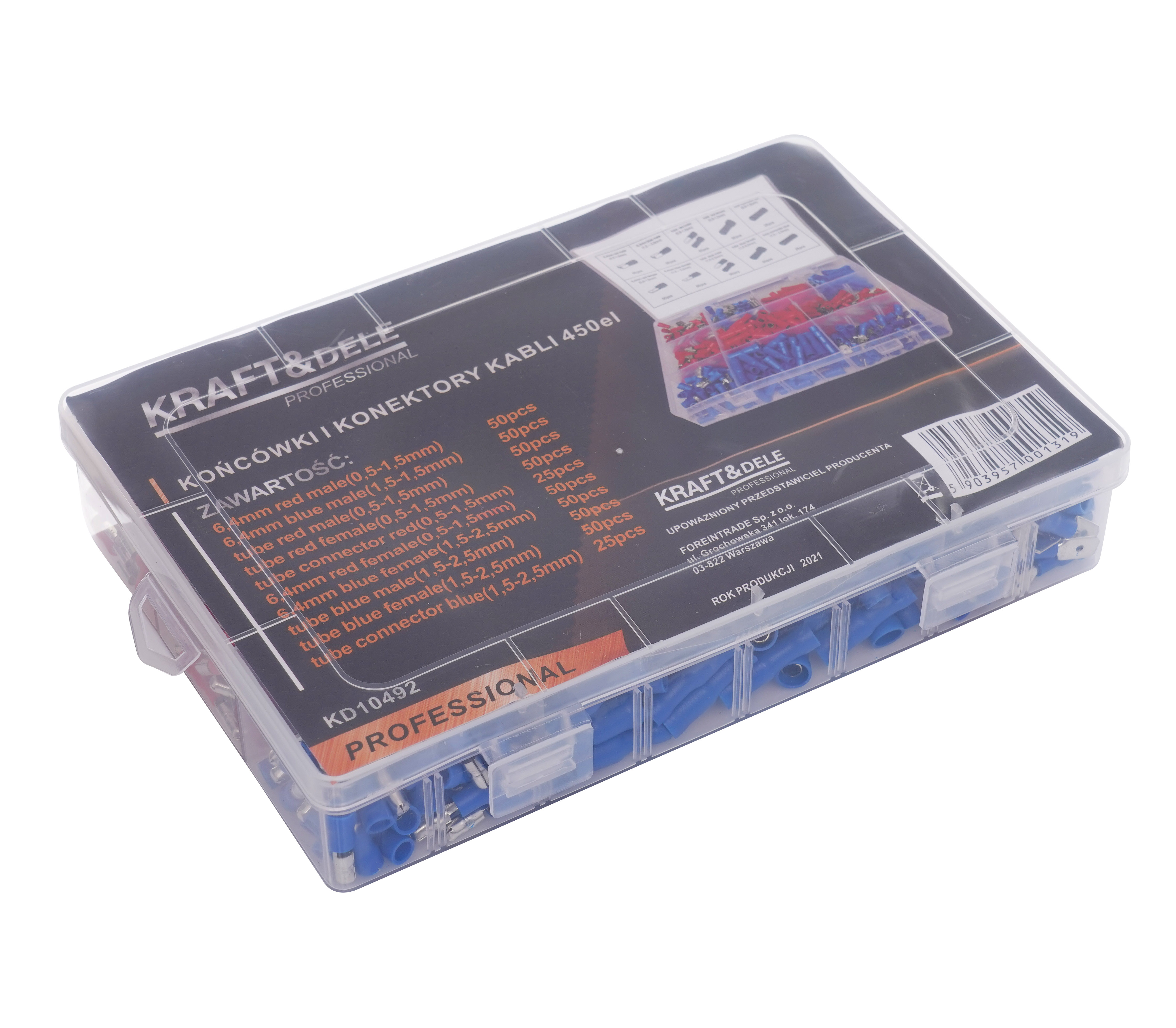 Autóipari csatlakozók - női, hím és csőcsatlakozók a Kraft&Dele márkától, KD10492 modell, praktikus, masszív tokban szállítva, amely megkönnyíti a különböző típusú csatlakozók rendszerezését. A csatlakozók végei a vezetékek elektromos készülékekkel való összekötésére, illetve más vezetékekkel történő kapcsolásra szolgálnak.