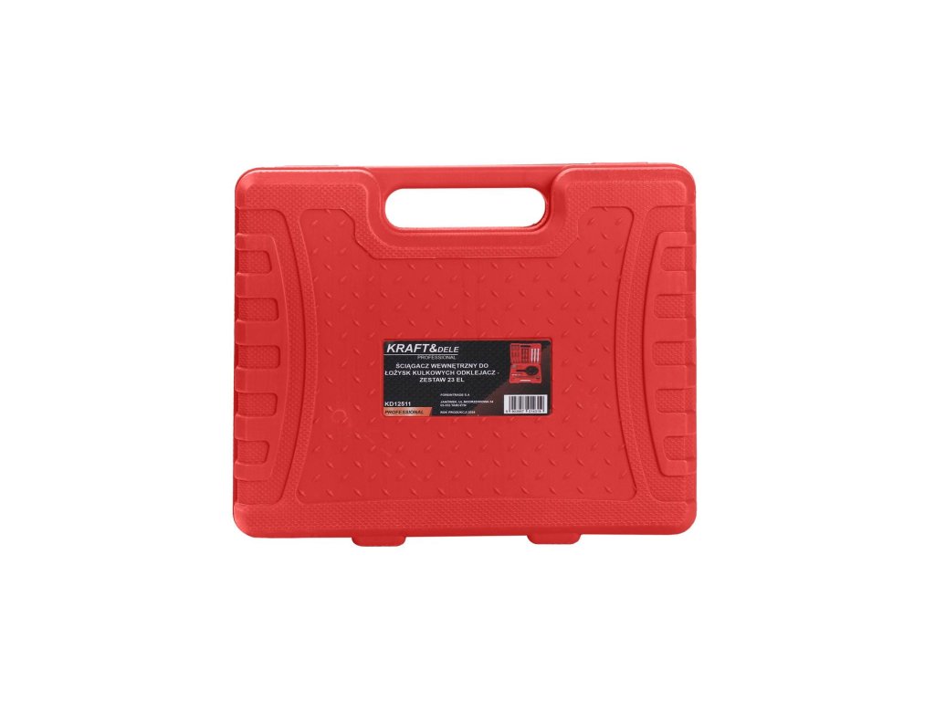 Minden alkatrész a csapágylehúzó készletből strapabíró műanyag tokkban található, fogantyúval a biztonságos tároláshoz és gyors rendszerezéshez. Minden alkatrész pontosan illeszkedő rekeszekben van, amelyek biztosítják a szerszám rendjét és meghosszabbítják az élettartamát.