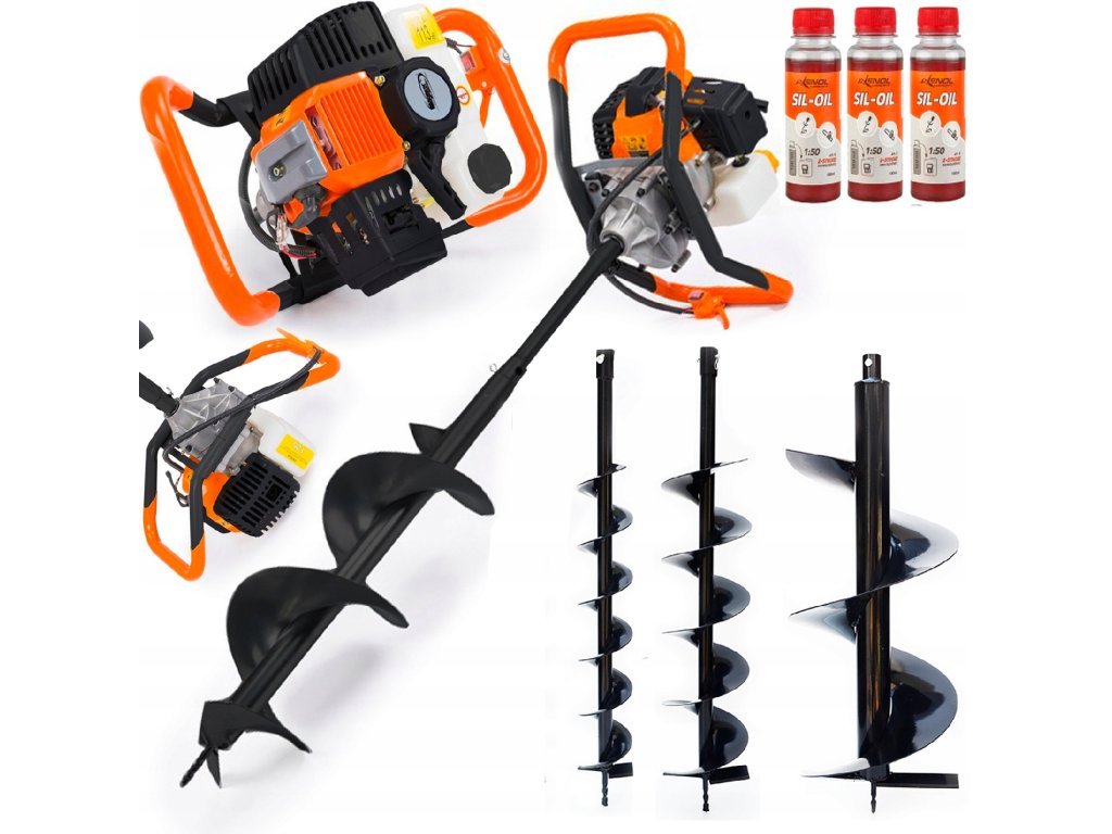 Benzinmotoros földfúró készlet + fúrók 10/15/20 cm