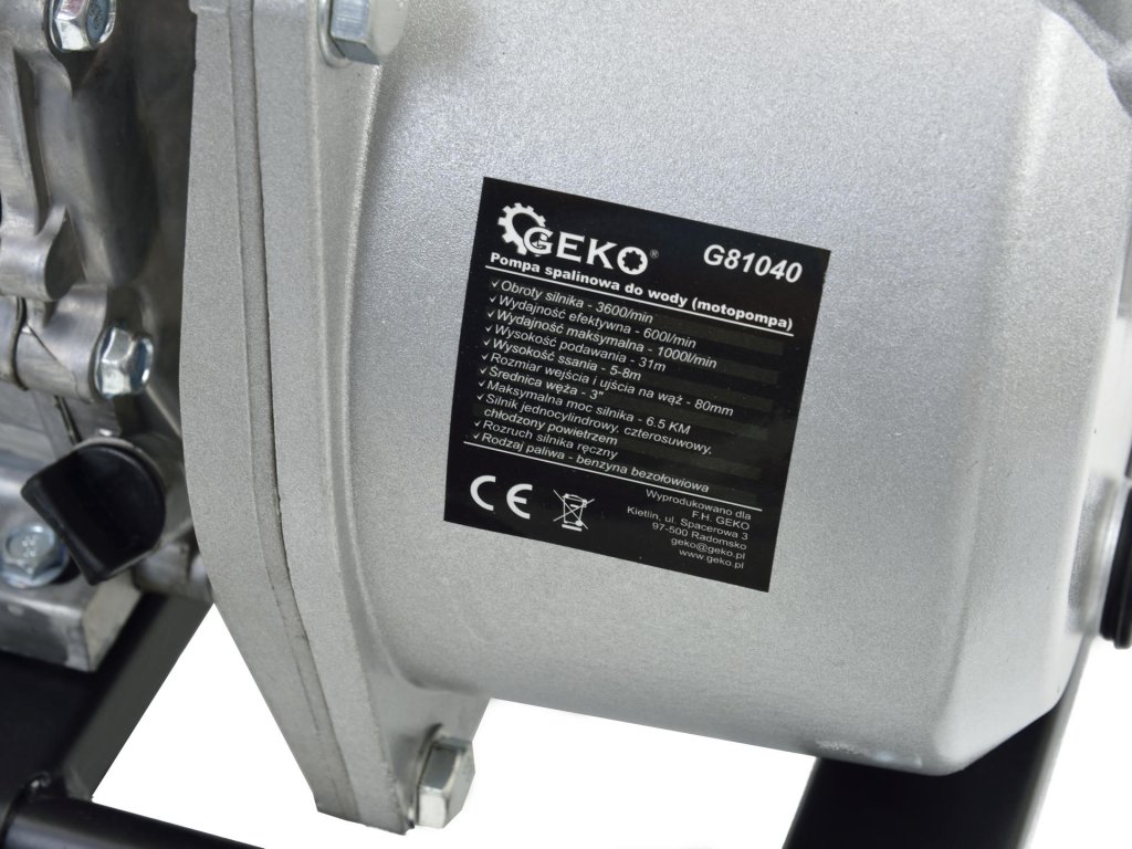 Benzinmotors vízszivattyú, motoros szivattyú 3" G81040 egy kiváló berendezés, mely tiszta és szennyezett víz szivattyúzására készült. Ideális használatra mezők és kertek öntözésénél, víz eltávolításánál elöntött területekről, víztározókból és építési árkokból. Tökéletes választás olyan helyeken, ahol nincs elektromos áram.