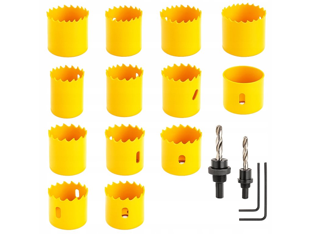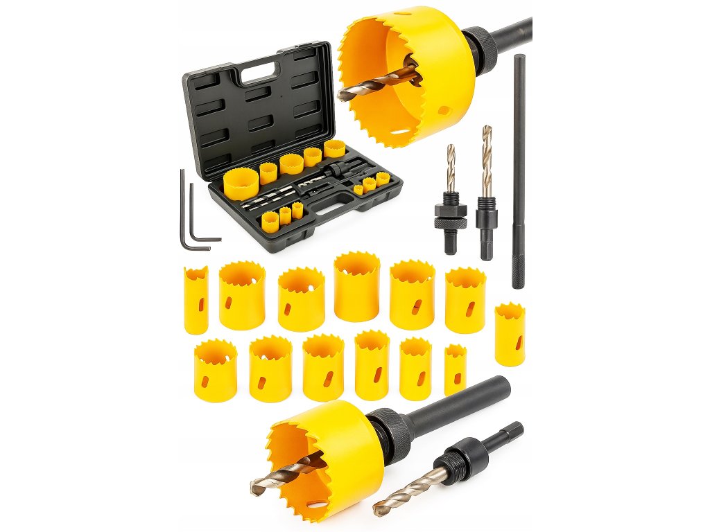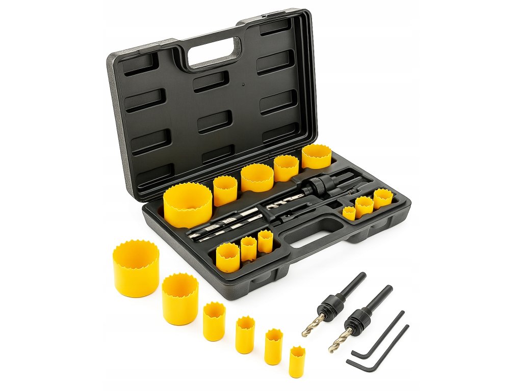 A készlet 13 db 19-76 mm átmérőjű lyukfűrészt, két adapterrel ellátott előfúrót (3/8" HEX és 7/16" HEX), feltéteket és imbuszkulcsokat tartalmaz. Minden kényelmesen tárolható egy tartós műanyag tokban.