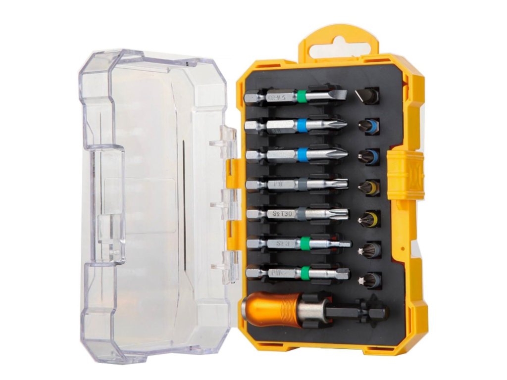 Professzionális bitkészlet különböző méretű bitfejekkel.