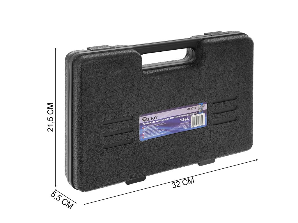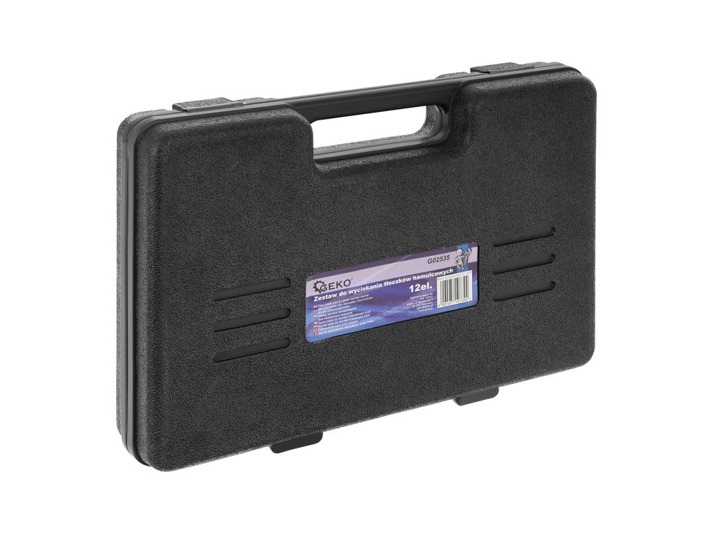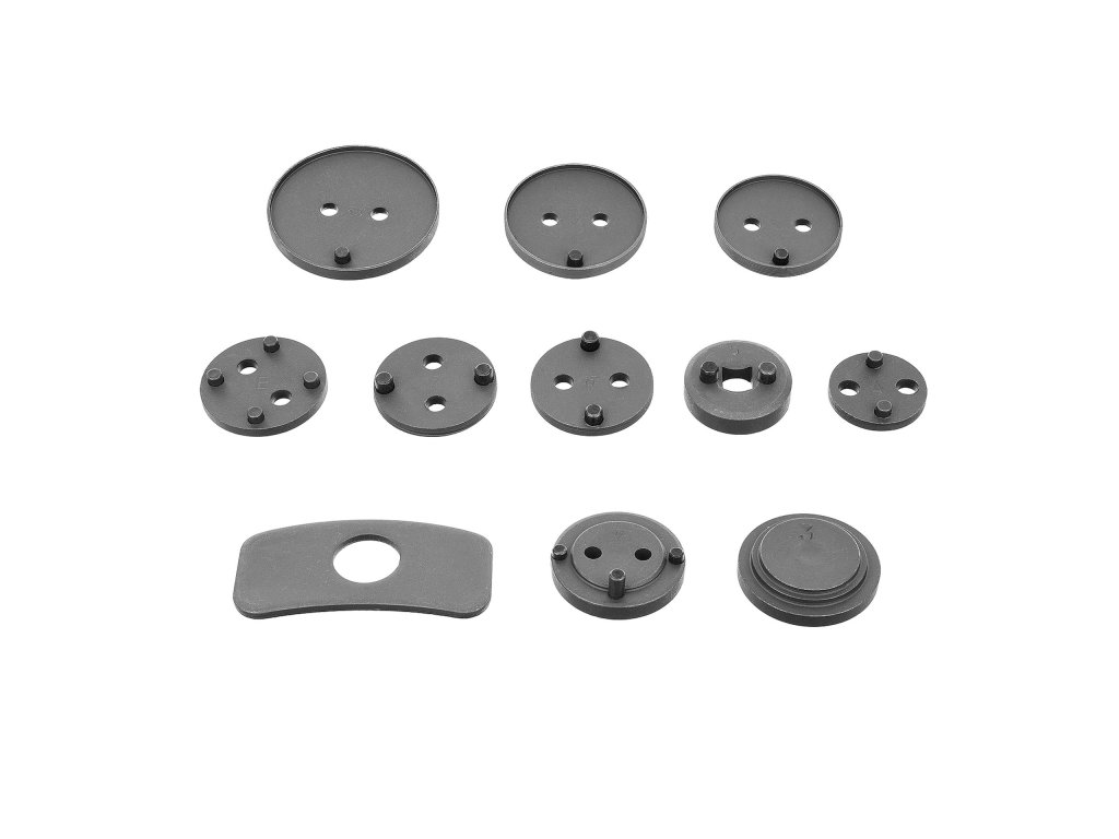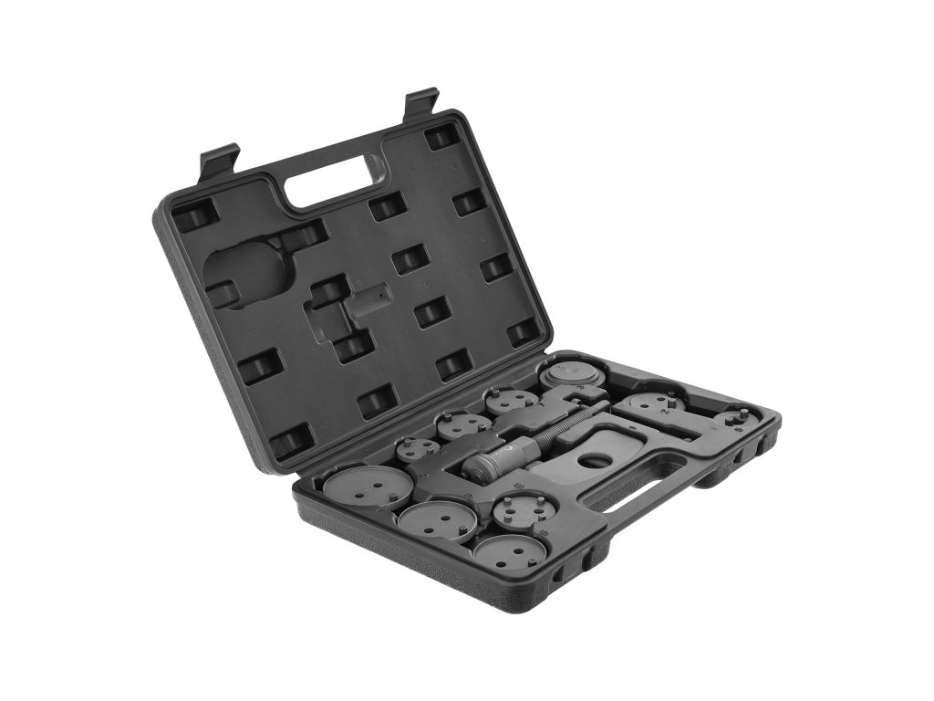 A 12 db adaptert tartalmazó készlet elengedhetetlen eszköz a fékdugók összenyomásához és kihúzásához a tárcsafékes járművek javítása során. Az adapterek különböző autómárkákhoz és modellekhez lettek tervezve, beleértve a General Motors, Cadillac Seville, Eldorado, Citroen XM, Xantia, Alfa Romeo, Audi, BMW, Ford Fiesta, Honda Concerto, Mercedes-Benz, Mitsubishi Colt, Nissan Micra, Range Rover, Toyota Camry, VW Passat, Golf GTI, Volvo, Fiat, Ford Telstar, Laser, Saturn, Grand Prix, Lumina, Honda Prelude, CRX, Mazda, Saab, Subaru, Nissan Primera, Audi 80, 90, V8, 100, Coupe, Ford Sierra ABS, Granada, Scorpio, Blue Bird Primera, Rover, Peugeot 405, Toyota Celica, Corolla GT, MR2, VW Golf, Passat, Corrado, Scirocco, Jetta, és még sok más. A készlet része egy forduló fej mágneses csúccsal, amely megkönnyíti a fékdugók kezelését. Ez a professzionális készlet alkalmas mechanikusok és hobbisták számára, akik járművek karbantartásával és javításával foglalkoznak.