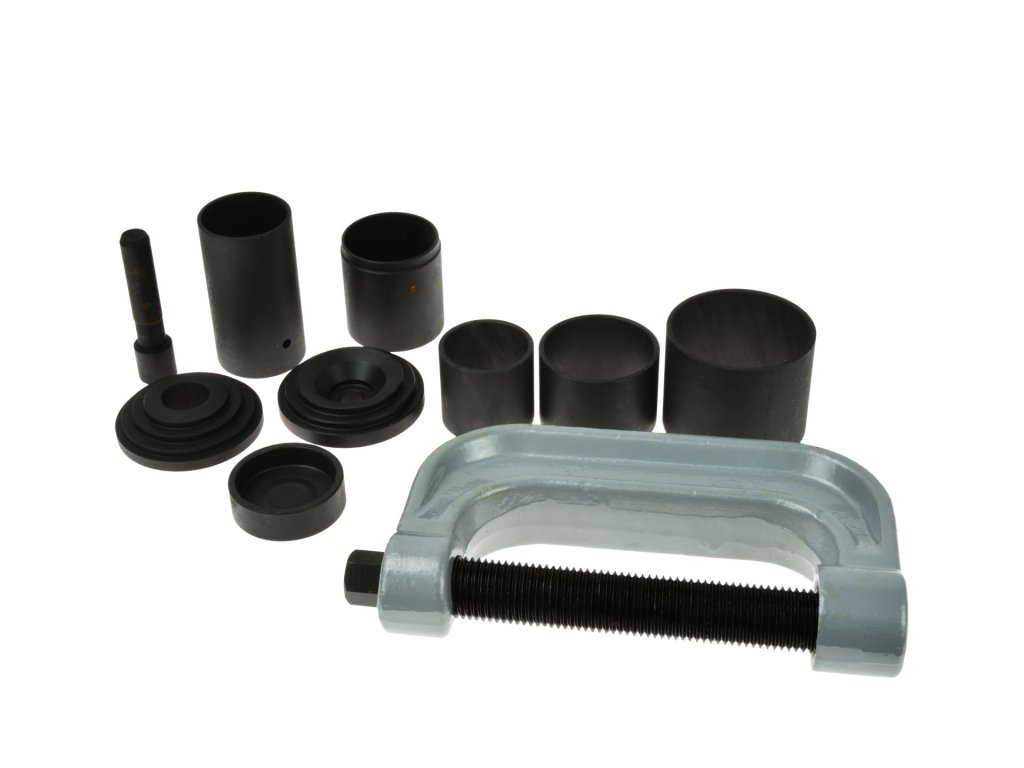 A csapágy és a felfüggesztési csapok felszerelésére és eltávolítására szolgáló eszköz könnyedén lehetővé teszi a betoló elemek, mint a gömbcsapok és fékcsapok beszerelését és eltávolítását. A készlet eszközei kiváló minőségű öntöttvasból és edzett szénacélból készültek, ami magas fokú ellenállóságot és tartósságot biztosít. Az egész készlet robusztus műanyag bőröndben van csomagolva, a könnyű szállítás és tárolás érdekében.