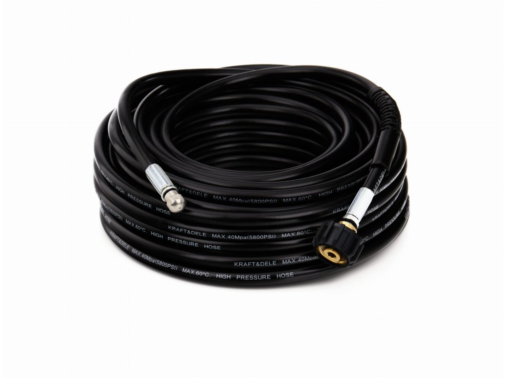 Kraft&Dele márkájú csatornatisztító tömlő, KD2059 modell, 20 m hosszú, csatornaszennyezések tisztítására tervezve, kompatibilis a magasnyomású mosókkal.