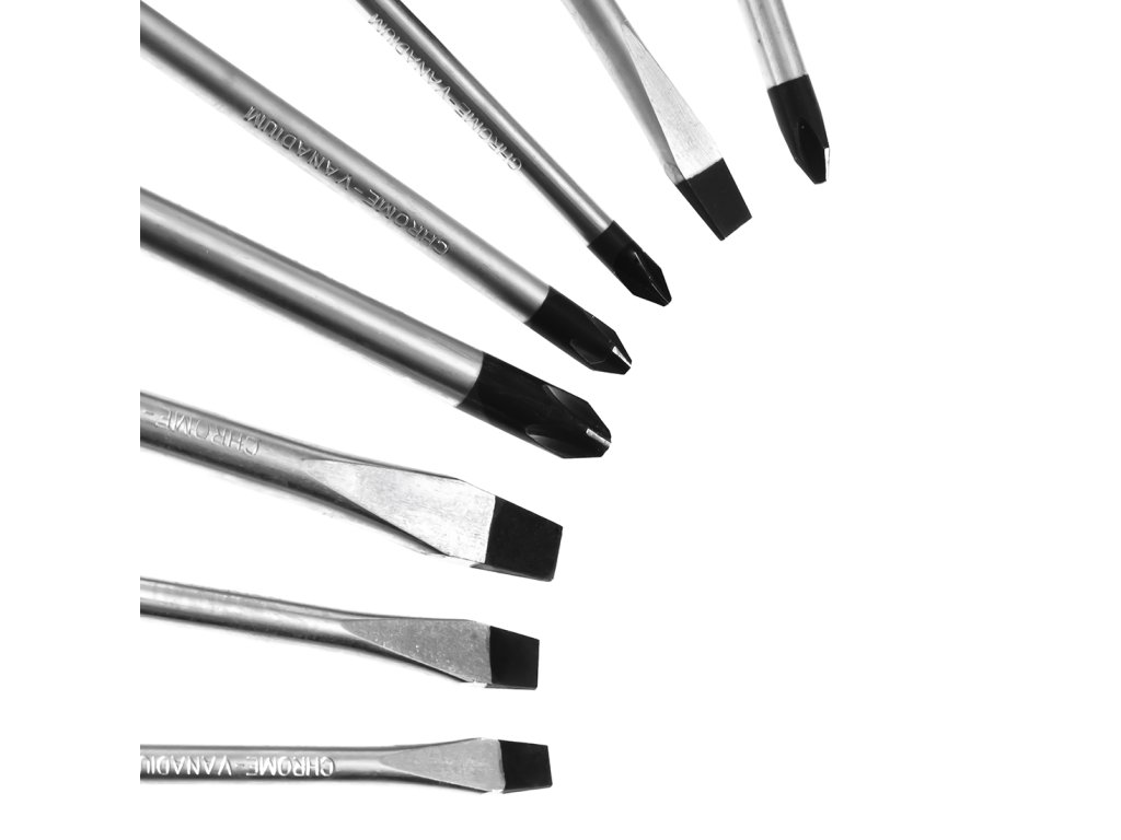 A csavarhúzókhoz tartozó mágneses bit-ek használata még több lehetőséget és pontosságot kínál a nehezen hozzáférhető helyeken végzett csavarozás során. A felhasznált anyagok, például a króm-vanádium ötvözet, jelentősen megnöveli a csavarhúzók élettartamát és tartósságát. A készlet része egy mágnetizáló eszköz is, amely lehetővé teszi a csavarhúzók, bitek, kulcsok és egyéb acél elemek és szerszámok egyszerű mágneses és demágneses állapotba hozását. Ez az eszköz nem igényel áramot, és a rendkívül erős mágnes nagyszerű segítséget nyújthat a munkahely megtisztításában, például a fémforgácsoktól.