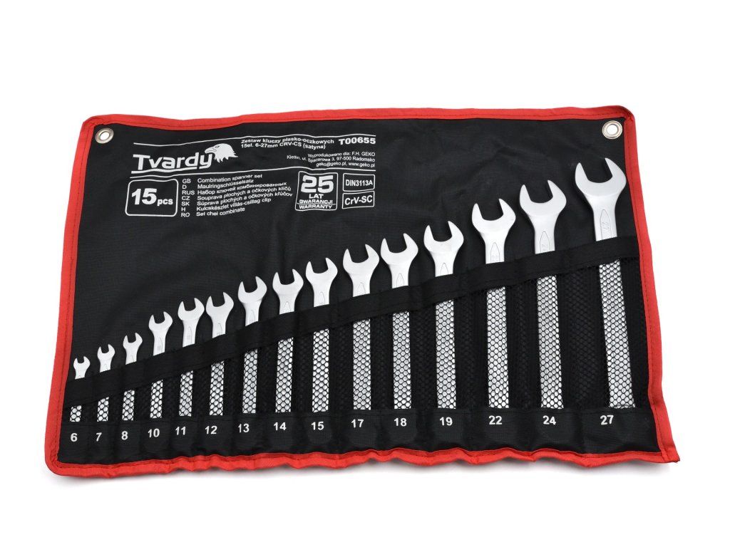 A TVARDY márkájú profik szem-kulcs készlet ideális eszköz minden profi és hobbimechanikus számára. Ez a készlet 15 kulcsot tartalmaz, 6-27 mm méretekben, amelyeket egy strapabíró vászonban tárolnak, megerősített rögzítésekkel, így falra akasztható.