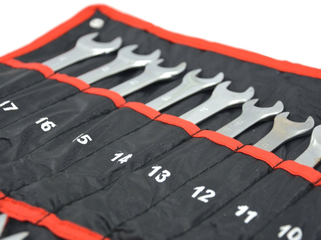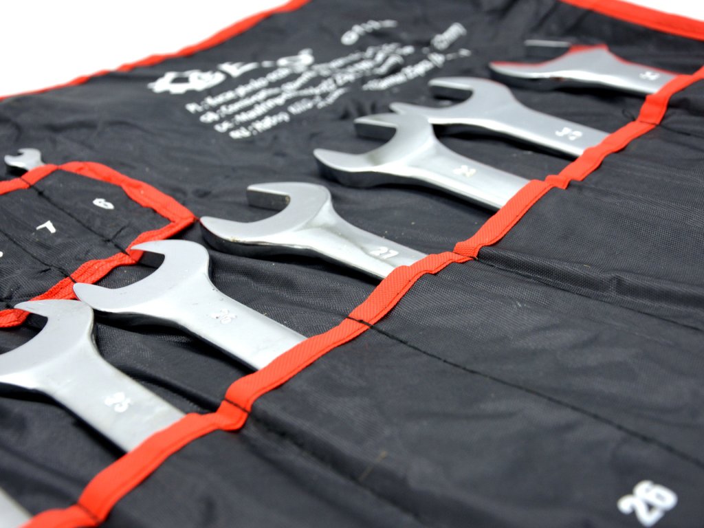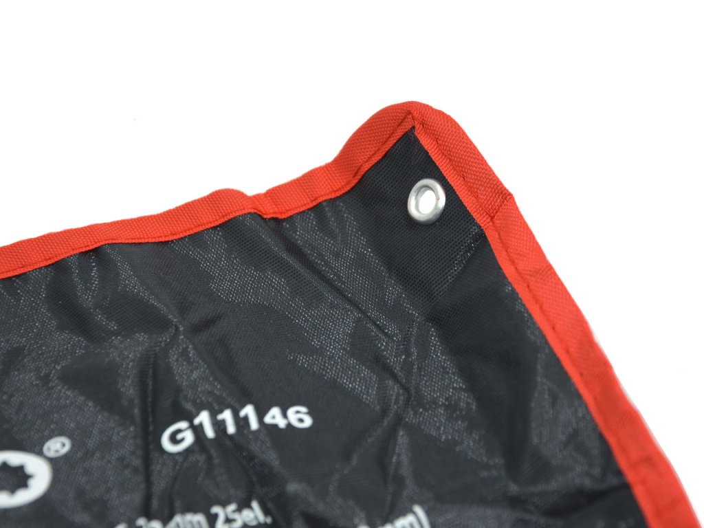Csillag-villáskulcs készlet, 25 db, kiváló minőségű krom-vanádium acélból (CrV) készült. A készlet tartalmaz egy strapabíró vászontáskát is, tépőzárral és falra akasztható lehetőséggel, amely megkönnyíti a rendezést és tárolást.