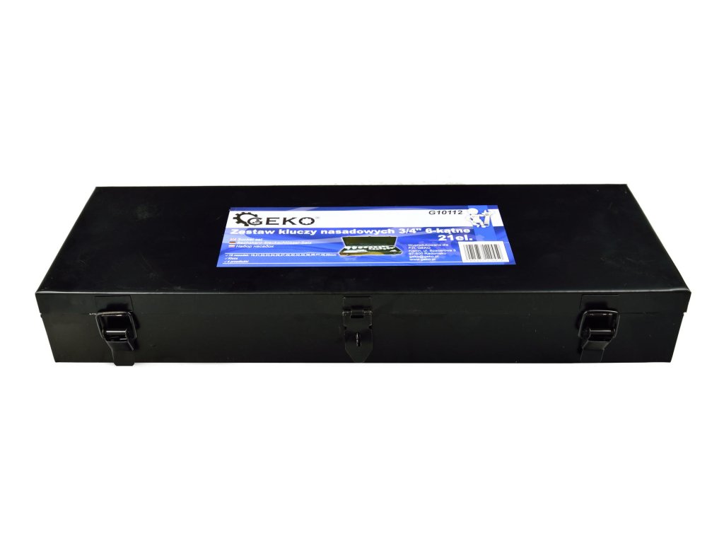 Dugókulcs készlet GEKO 21 db alkatrészt tartalmaz, és ideális a hozzáértő felhasználók számára. Ez a készlet büszkélkedhet 6szögletű dugókulcsokkal, 3/4"-os nyílással, masszív T-használati fogantyúval (3/4"), kiváló ráccsal (3/4") és hosszabbító készlettel (3/4"). Minden alkatrész magas minőségű króm-vanádium acélból CrV készült. A készlet biztonságosan egy fém tárolóban helyezkedik el, amely hosszú élettartamot biztosít.