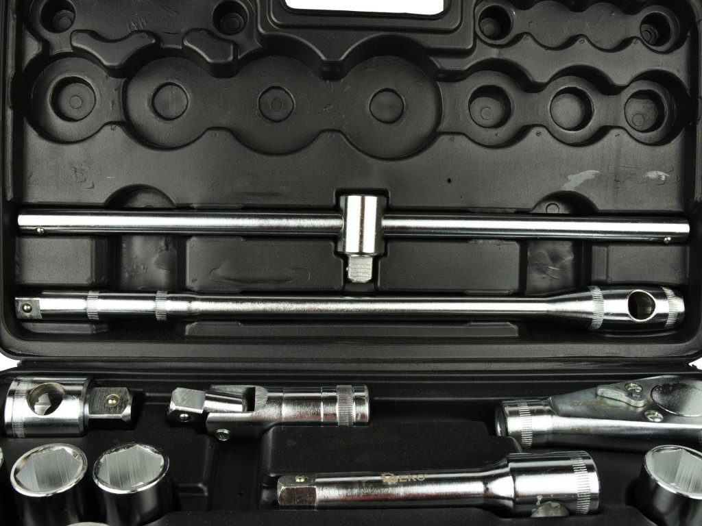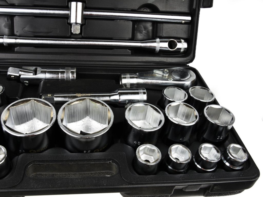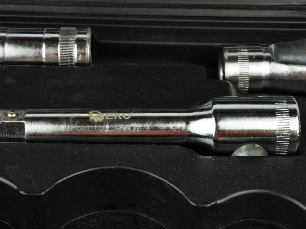 Dugókulcs készlet GEKO 26 db-ból áll, gondosan megtervezve a maximális funkcionalitás és tartósság érdekében. A készlet tartalmaz 6-szögletű fejeket 3/4" és 1" méretben, T-rúgókezelőt (3/4"), ráct (3/4"), hosszabbító rudakat (3/4") és reduktor-t 1". Minden egyes darab kiváló minőségű króm-vanádium acélból CrV készült, garantálva a hosszú élettartamot és megbízhatóságot.