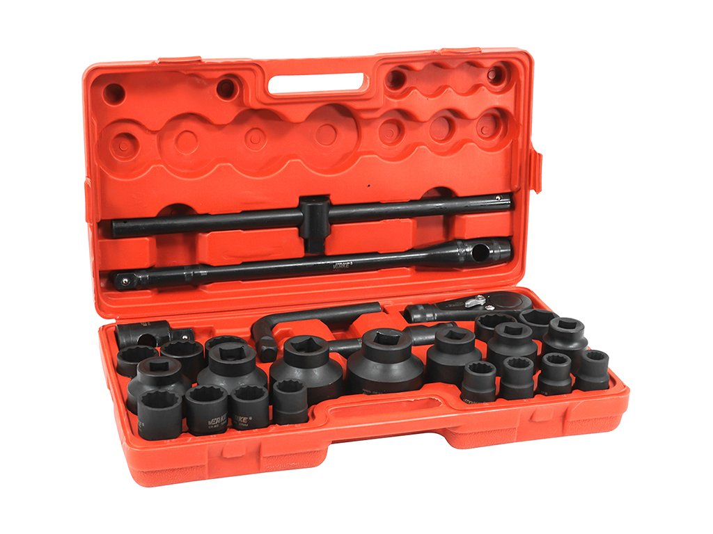 A dugókulcs készlet 26 db 3/4"-1" hatszögletű és tizenkét oldalú dugókulcsot tartalmaz. Ezek a dugókulcsok együtt a racsnikkal és meghosszabbító adapterekkel rendkívül kemény CR-MO anyagból készültek, és praktikusan egy hordozható tárolókban találhatóak.