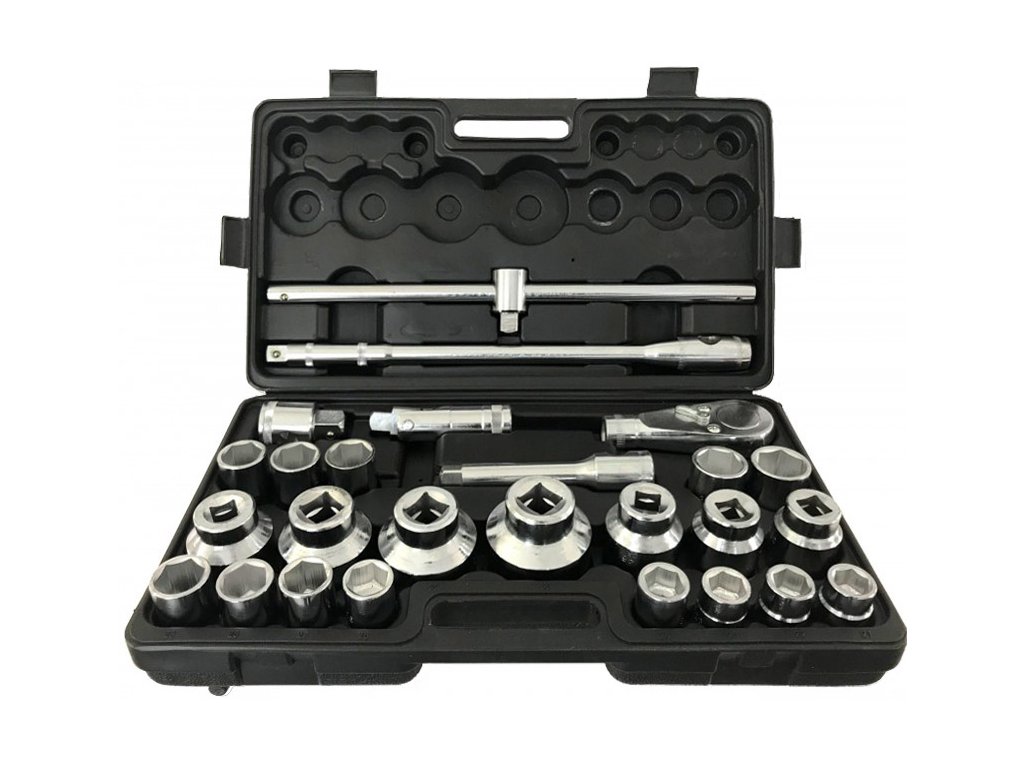 Dugókulcs készlet 26 db 3/4" és 1". Ez a készlet tartalmaz dugókulcsokat, ráccsal és hosszabbítót, melyeket nagyon kemény anyagból készítettek, egy praktikus kofferben.