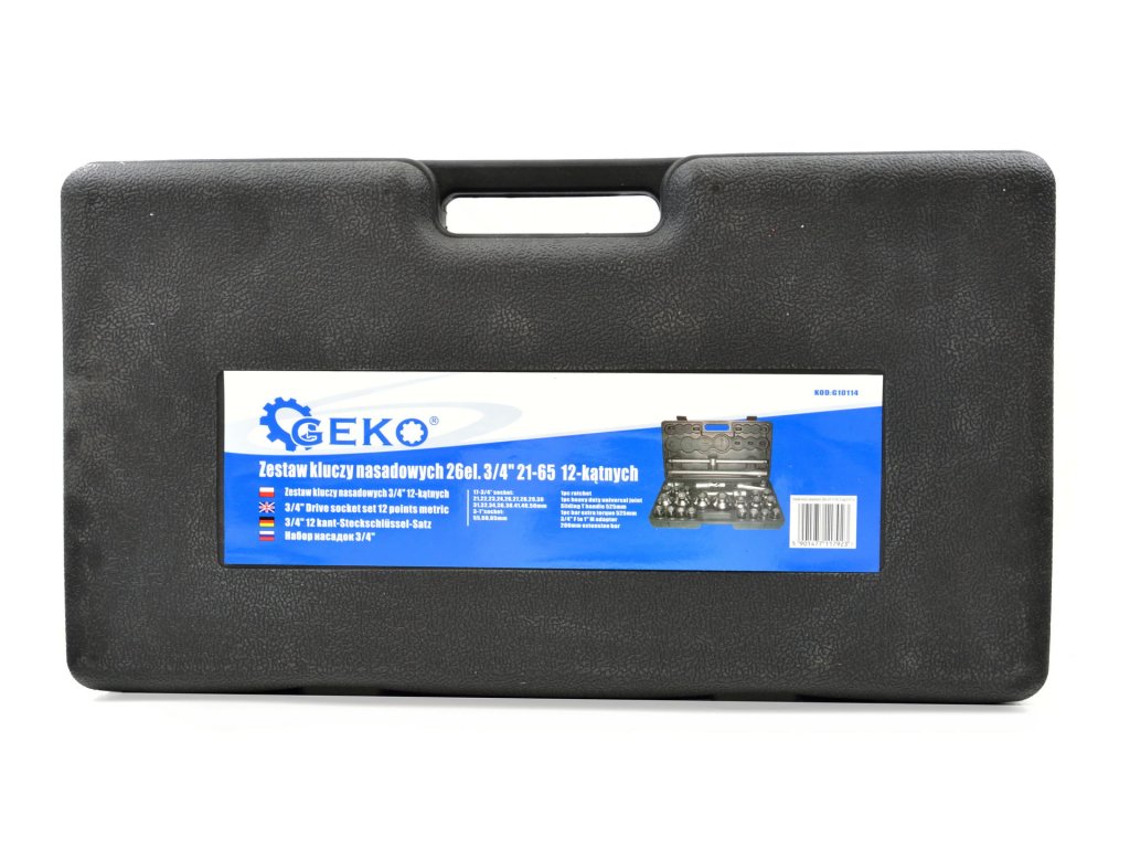 GEKO Dugókulcs készlet 26 elemet tartalmaz, amelyek kielégítik mind a hobbi, mind a profi felhasználók igényeit. A készlet 12-hornyú dugókulcsokat tartalmaz 3/4" és 1" nyílással, T alakú karokat (3/4"), ráccsákat (3/4"), hosszabbító dugókulcsokat (3/4") és 1" áttételt.