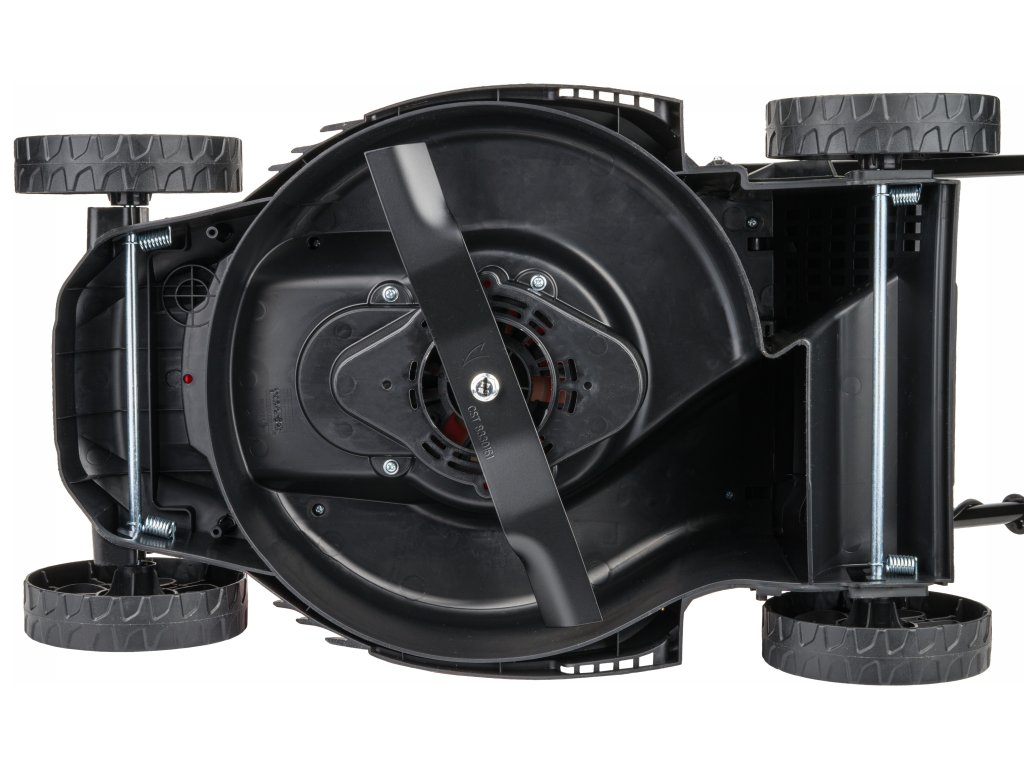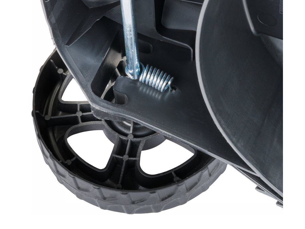 A fűnyíró 3-fokozatú magasságállítással van ellátva. Elegendő egy oldalra dönteni, és a kívánt kerekesség magasságra húzni, miközben a beállítást egy rugó biztosítja.