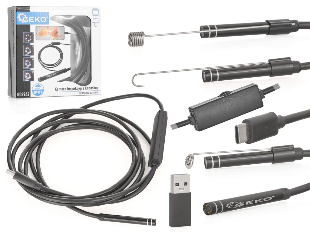 Vízálló endoszkópiai kamera USB beépített LED világítással. Ez a kamera hat állítható fényerejű LED lámpával rendelkezik, amely lehetővé teszi a legnagyobb sötétségű helyek felfedezését is, mint például csövek, szellőzőcsatornák vagy egyéb nehezen hozzáférhető területek. Az endoszkóp kompatibilis az Android 6.0 és újabb operációs rendszert futtató okostelefonokkal és táblagépekkel, amelyek támogatják az OTG szabványt. A csomag tartalmaz egy kiegészítő készletet (horog, mágnes és tükör).