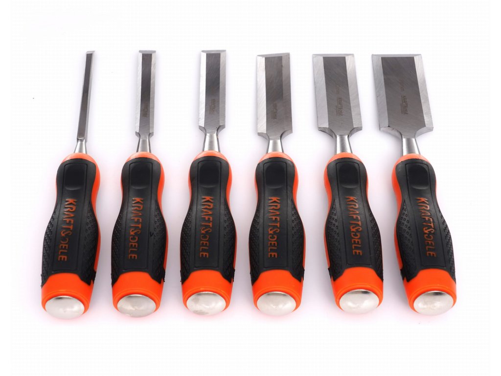 A KRAFT&DELE márkájú professzionális favágó vésők 6 darabos készlet. Modell: KD11772. A fa megmunkálására szolgál, például vágáshoz, faragáshoz, szobrászathoz és hasonló feladatokhoz.