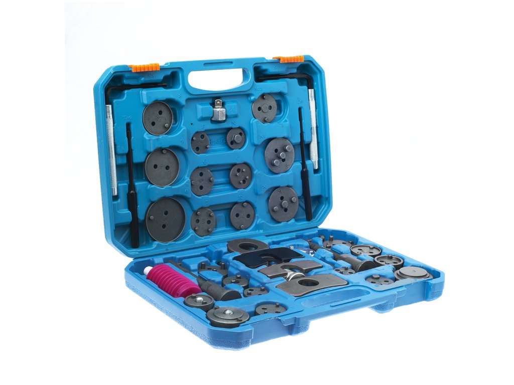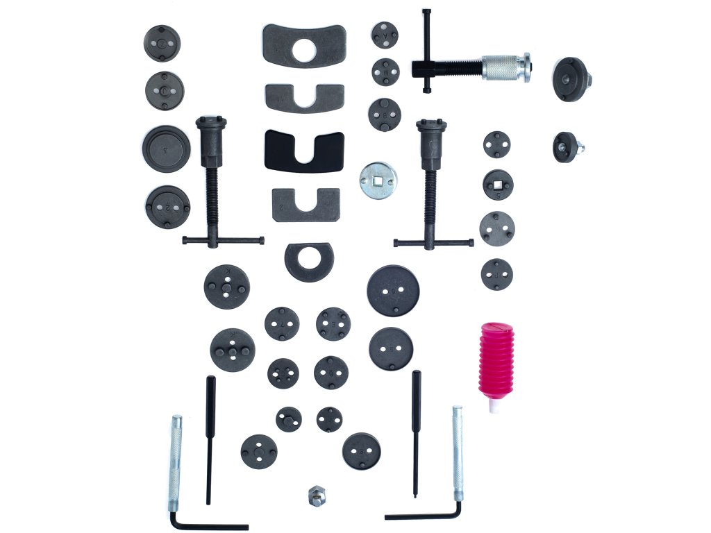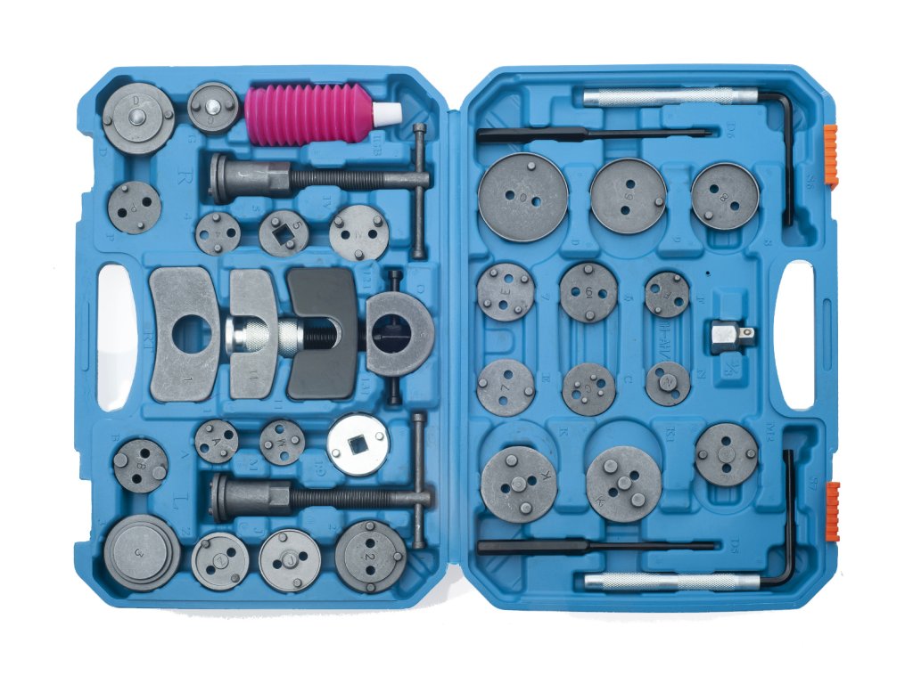 - Kézi meghajtású féknyereg tartó szeparátor készlet, amely alkalmas nyomott dugattyús (első fékek) és csavaros (hátsó fékek) féknyergek kezelésére.