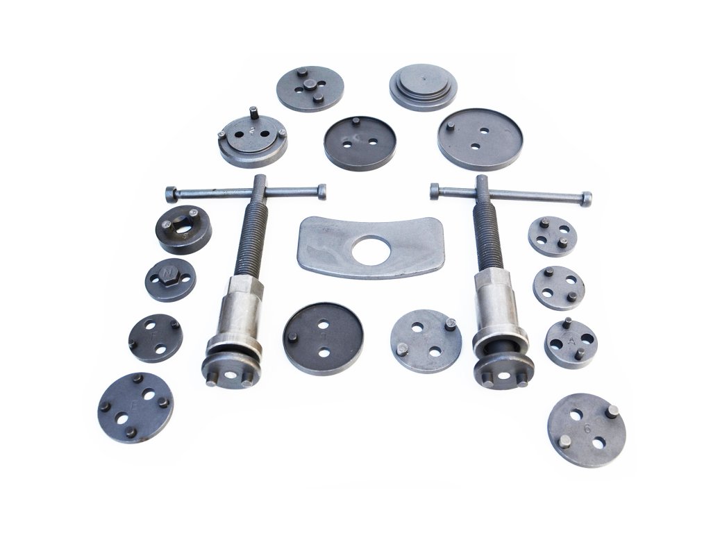 Ez a féknyeregek visszanyomó készlet 18 db tartalmaz 18 darab szerszámot, beleértve egy masszív műanyag tárolódobozt is, amely megkönnyíti a szállítást és védi az eszközöket. A készlet kiváló minőségű acélból készült, és két nyomóeszközt foglal magában (jobbra- és balra tekerős), két különböző támasztólemezt féknyergekhez, valamint több adaptert, amelyek különböző méretű fékdugattyúkhoz illeszthetők, melyek a legtöbb személygépkocsiban, mind az európai, mind pedig az ázsiai piacon használatosak.