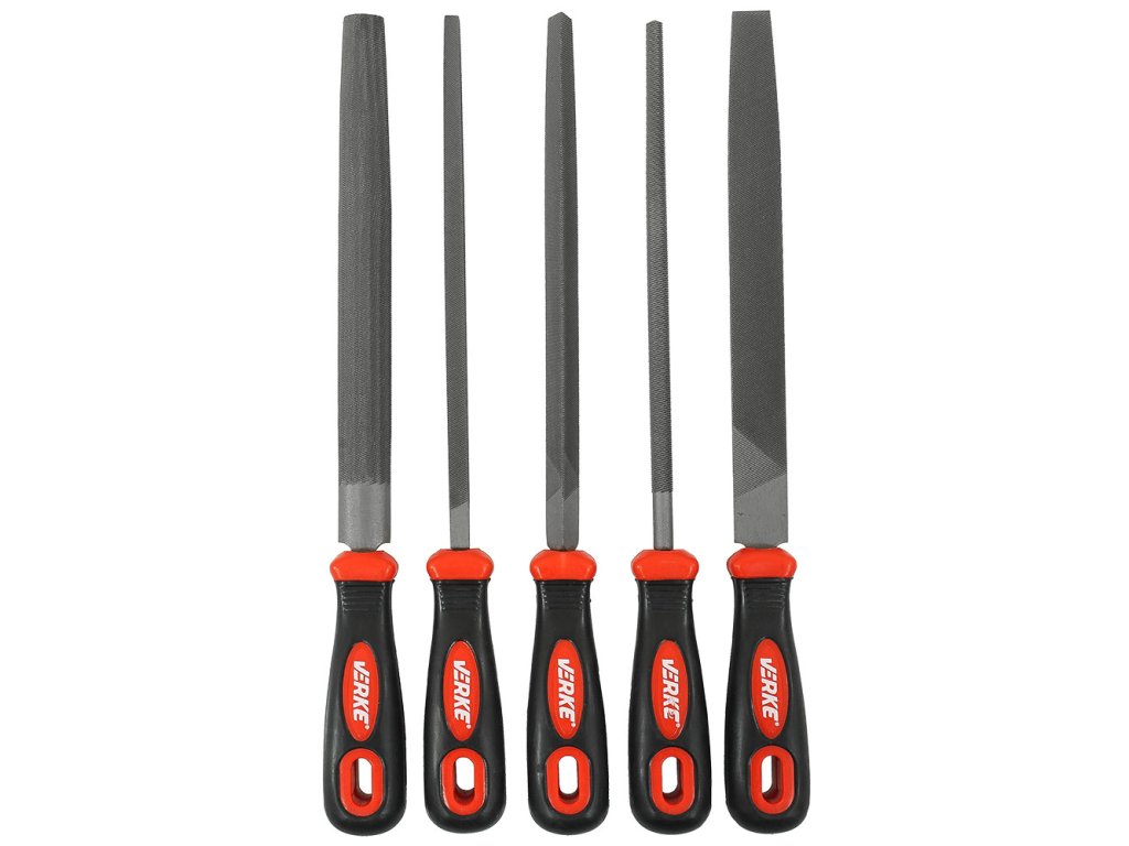 Fémfúró készlet 8" 5 db VERKE V05079 tartalmazza a kónikus profilú fúrókat: lapos és félkör alakú, valamint kerek, háromszögletű és négyzetes fúrókat. A fúrók duplán élezettek, tartós műanyag markolattal rendelkeznek. Munka hossza: 20 cm. HRC keménység: 62.