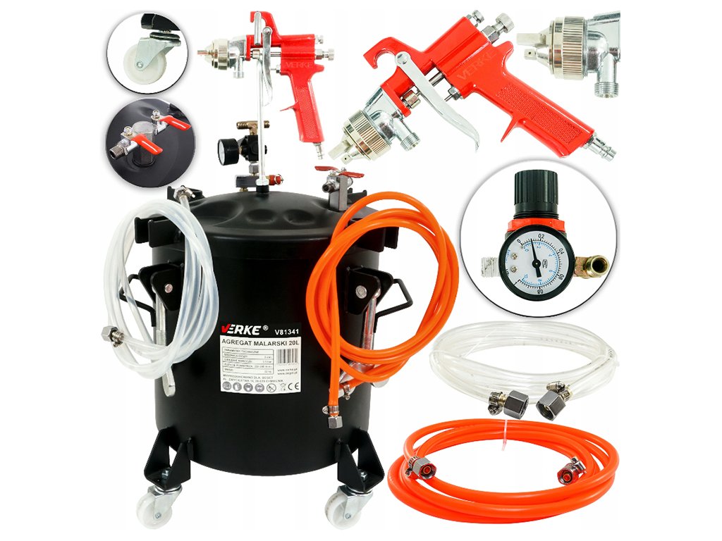 Pneumatikus festékszóró, amely a festéktartállyal együtt használható. A szett nagyon jó permetezési paraméterekkel és magas festési sebességgel rendelkezik. A szórórendszer lehetővé teszi a nagy mennyiségű festék gyors alkalmazását, amely időt és pénzt takarít meg. A sima acél nyomástartály magas korrózióállósággal bír. A készülék gyakorlatilag minden típusú festék és lakk, ragasztók, emulziók, pácolók, korrózióálló festékek és permetezhető tapéták alkalmazására alkalmas. A tartály 4 forgatható kerékkel van felszerelve az egyszerű mozgatás érdekében.
