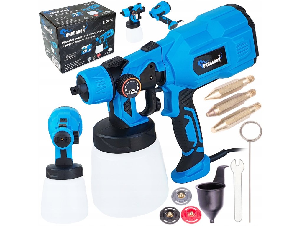 A Festékszóró pisztoly teljesítménye 550 W, amely ideális eszköz otthoni festéshez és felújításhoz. Gyors és egyenletes szín, lakk, alapozó és tömítő anyagok alkalmazását teszi lehetővé különböző felületeken. A három cserélhető fúvókának és a fújási szélesség és intenzitás beállításának köszönhetően könnyedén alkalmazkodik az Ön egyedi igényeihez.