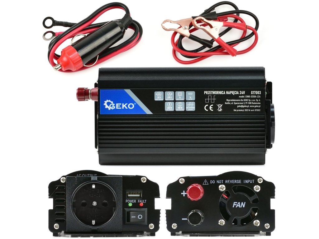 Az átalakító folyamatos teljesítménye 350W, maximális rövid távú teljesítménye pedig 700W. A csomag tartalmaz egy kábelt autós aljzatba való csatlakozáshoz és egy kábelt terminálokkal.
