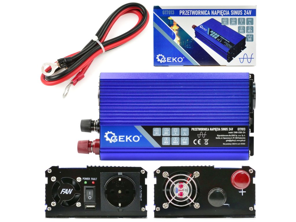Feszültségátalakító 24V/230V 500/1000W – tiszta szinuszos ideális megoldás a 24V-os akkumulátorokból származó egyenáram váltakozó árammá alakítására 230V-os feszültséggel. Ez az átalakító USB aljzattal van felszerelve, amely lehetővé teszi mobil eszközök táplálását és töltését.