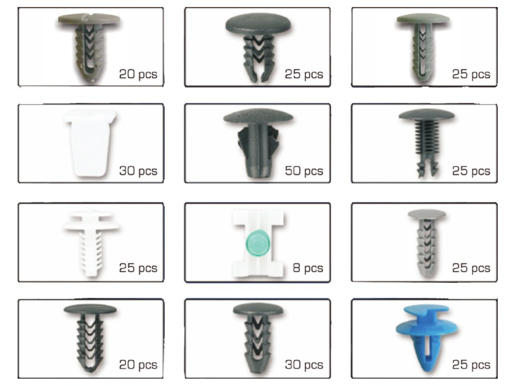 FIAT autós klipszek praktikus kollekciót tartalmaz, 308 db klipszből, 12 különböző típusban. Ez a szett ideális mindenki számára, aki megbízható és minőségi klipszeket keres gépjárművének javításához vagy karbantartásához.