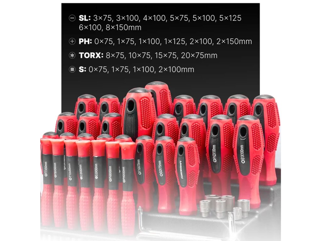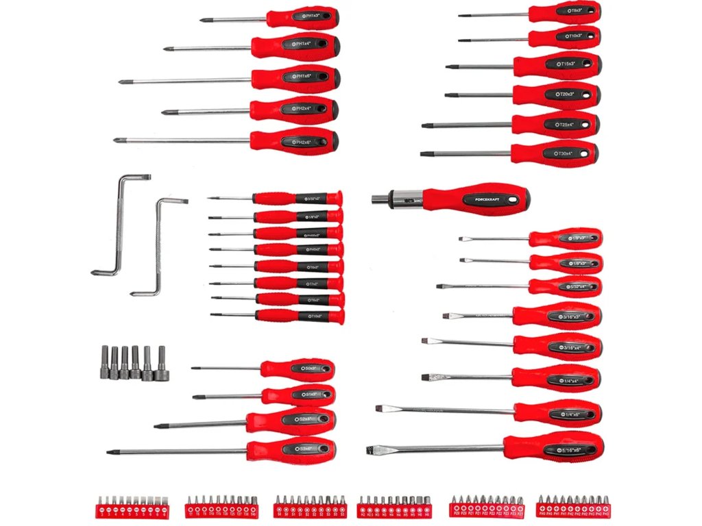 A készlet lapos, Phillips, Torx és négyszögletes csavarhúzókat, valamint bitek és dugókulcsok széles választékát tartalmazza, szinte az összes gyakran használt csavar- és csapszegtípust lefedve.